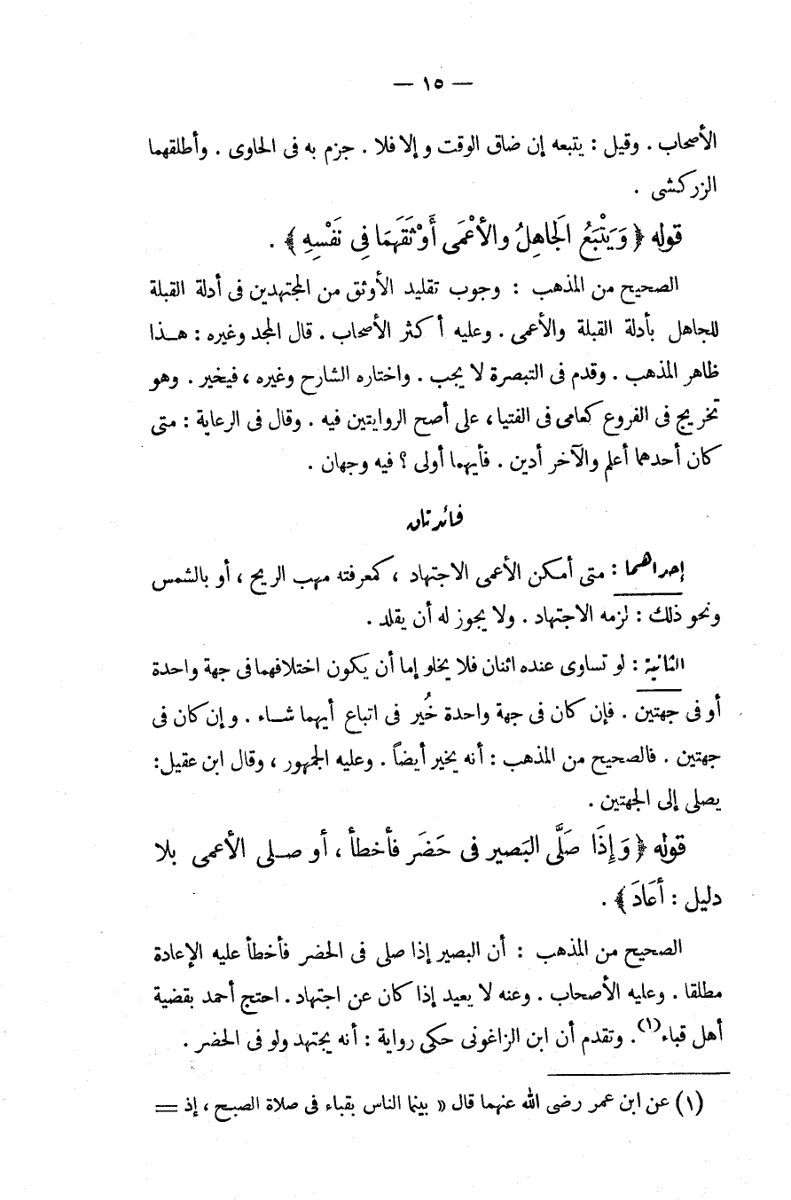 قَوْلُهُ (وَيَتْبَعُ الْجَاهِلُ وَالْأَعْمَى أَوْثَقَهُمَا فِي نَفْسِهِ) الصَّحِيحُ مِنْ الْمَذْهَبِ: وُجُوبُ تَقْلِيدِ الْأَوْثَقِ مِنْ الْمُجْتَهِدِينَ فِي أَدِلَّةِ الْقِبْلَةِ لِلْجَاهِلِ بِأَدِلَّةِ الْقِبْلَةِ وَالْأَعْمَى، وَعَلَيْهِ أَكْثَرُ الْأَصْحَابِ قَالَ الْمَجْدُ وَغَيْرُهُ: هَذَا ظَاهِرُ الْمَذْهَبِ وَقَدَّمَ فِي التَّبْصِرَةِ لَا يَجِبُ. وَاخْتَارَهُ الشَّارِحُ وَغَيْرُهُ، فَيُخَيَّرُ، وَهُوَ تَخْرِيجٌ فِي الْفُرُوعِ كَعَامِّيٍّ فِي الْفُتْيَا، عَلَى أَصَحِّ الرِّوَايَتَيْنِ فِيهِ، وَقَالَ فِي الرِّعَايَةِ: مَتَى كَانَ أَحَدُهُمَا أَعْلَمَ وَالْآخَرُ أَدْيَنَ فَأَيُّهُمَا أَوْلَى؟ فِيهِ وَجْهَانِ.