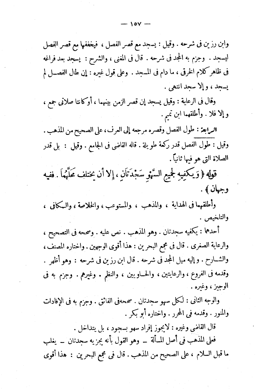وَابْنُ رَزِينٍ فِي شَرْحِهِ، وَقِيلَ: يَسْجُدُ مَعَ قِصَرِ الْفَصْلِ، فَيُخَفِّفُهَا مَعَ قِصَرِ الْفَصْلِ لِيَسْجُدَ وَجَزَمَ بِهِ الْمَجْدُ فِي شَرْحِهِ قَالَ فِي الْمُغْنِي، وَالشَّرْحِ: يَسْجُدُ بَعْدَ فَرَاغِهِ فِي ظَاهِرِ كَلَامِ الْخِرَقِيِّ، مَا دَامَ فِي الْمَسْجِدِ، وَعَلَى قَوْلِ غَيْرِهِ: إنْ طَالَ الْفَصْلُ لَمْ يَسْجُدْ، وَإِلَّا سَجَدَ. انْتَهَى. وَقَالَ فِي الرِّعَايَةِ: وَقِيلَ يَسْجُدُ إنْ قَصُرَ الزَّمَنُ بَيْنَهُمَا، أَوْ كَانَتَا صَلَاتَيْ جَمْعٍ، وَإِلَّا فَلَا، وَأَطْلَقَهُمَا ابْنُ تَمِيمٍ، الرَّابِعَةُ: طُولُ الْفَصْلِ وَقِصَرُهُ مَرْجِعُهُ إلَى الْعُرْفِ، عَلَى الصَّحِيحِ مِنْ الْمَذْهَبِ، وَقِيلَ: طُولُ الْفَصْلِ قَدْرُ رَكْعَةٍ طَوِيلَةٍ، قَالَهُ الْقَاضِي فِي الْجَامِعِ، وَقِيلَ: بَلْ قَدْرُ الصَّلَاةِ الَّتِي هُوَ فِيهَا ثَانِيًا.