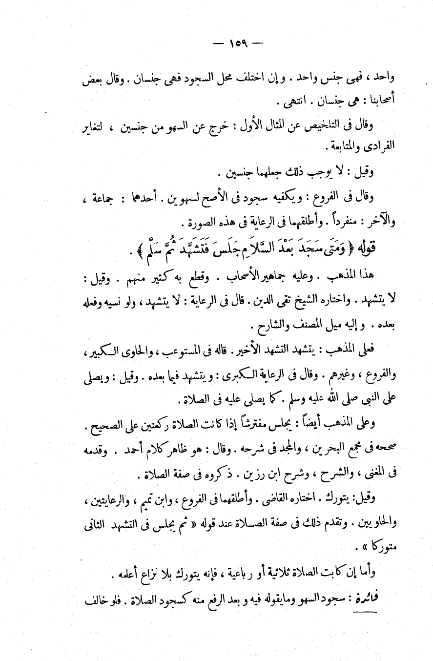 وَاحِدًا، فَهِيَ جِنْسٌ وَاحِدٌ، وَإِنْ اخْتَلَفَ مَحَلُّ السُّجُودِ فَهِيَ جِنْسَانِ، وَقَالَ بَعْضُ أَصْحَابِنَا: هِيَ جِنْسَانِ. انْتَهَى.، وَقَالَ فِي التَّلْخِيصِ عَنْ الْمِثَالِ الْأَوَّلِ: خَرَجَ عَنْ السَّهْوِ مِنْ جِنْسَيْنِ، لِتَغَايُرِ الْفُرَادَى وَالْمُتَابَعَةِ، وَقِيلَ: لَا يُوجِبُ ذَلِكَ جَعْلُهُمَا جِنْسَيْنِ، وَقَالَ فِي الْفُرُوعِ: وَيَكْفِيهِ سُجُودٌ فِي الْأَصَحِّ لِسَهْوَيْنِ أَحَدُهُمَا: جَمَاعَةً، وَالْآخَرُ: مُنْفَرِدًا، وَأَطْلَقَهُمَا فِي الرِّعَايَةِ فِي هَذِهِ الصُّورَةِ.