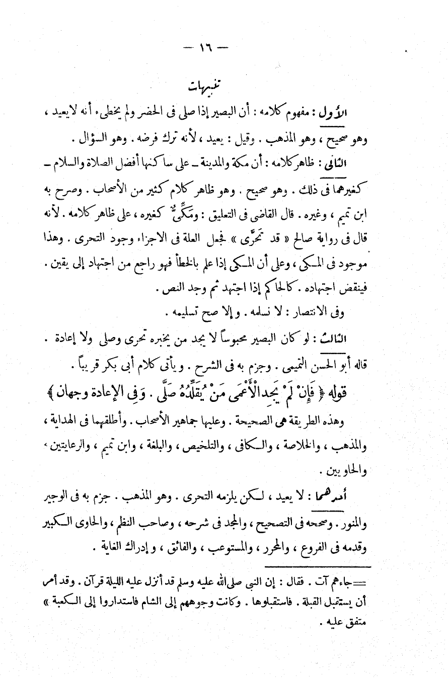 تَنْبِيهَاتٌ. الْأَوَّلُ: مَفْهُومُ كَلَامِهِ: أَنَّ الْبَصِيرَ إذَا صَلَّى فِي الْحَضَرِ وَلَمْ يُخْطِئْ أَنَّهُ لَا يُعِيدُ، وَهُوَ صَحِيحٌ، وَهُوَ الْمَذْهَبُ، وَقِيلَ: يُعِيدُ، لِأَنَّهُ تَرَكَ فَرْضَهُ، وَهُوَ السُّؤَالُ. الثَّانِي: ظَاهِرُ كَلَامِهِ: أَنَّ مَكَّةَ وَالْمَدِينَةَ عَلَى سَاكِنِهَا أَفْضَلُ الصَّلَاةِ وَالسَّلَامِ كَغَيْرِهِمَا فِي ذَلِكَ. وَهُوَ صَحِيحٌ، وَهُوَ ظَاهِرُ كَلَامِ كَثِيرٍ مِنْ الْأَصْحَابِ، وَصَرَّحَ بِهِ ابْنُ تَمِيمٍ، وَغَيْرُهُ قَالَ الْقَاضِي فِي التَّعْلِيقِ: وَمَكِّيٌّ كَغَيْرِهِ، عَلَى ظَاهِرِ كَلَامِهِ؛ لِأَنَّهُ قَالَ فِي رِوَايَةِ صَالِحٍ " قَدْ تَحَرَّى " فَجَعَلَ الْعِلَّةَ فِي الْإِجْزَاءِ وُجُودَ التَّحَرِّي، وَهَذَا مَوْجُودٌ فِي الْمَكِّيِّ، وَعَلَى أَنَّ الْمَكِّيَّ إذَا عَلِمَ بِالْخَطَأِ فَهُوَ رَاجِعٌ مِنْ اجْتِهَادٍ إلَى يَقِينٍ. فَيُنْقَضُ اجْتِهَادُهُ كَالْحَاكِمِ إذَا اجْتَهَدَ ثُمَّ وَجَدَ النَّصَّ، وَفِي الِانْتِصَارِ: لَا نُسَلِّمُهُ، وَالَأَصَحُّ تَسْلِيمُهُ. الثَّالِثُ: لَوْ كَانَ الْبَصِيرُ مَحْبُوسًا لَا يَجِدُ مَنْ يُخْبِرُهُ تَحَرَّى وَصَلَّى وَلَا إعَادَةَ، قَالَهُ أَبُو الْحَسَنِ التَّمِيمِيُّ وَجَزَمَ بِهِ فِي الشَّرْحِ، وَيَأْتِي كَلَامُ أَبِي بَكْرٍ قَرِيبًا.