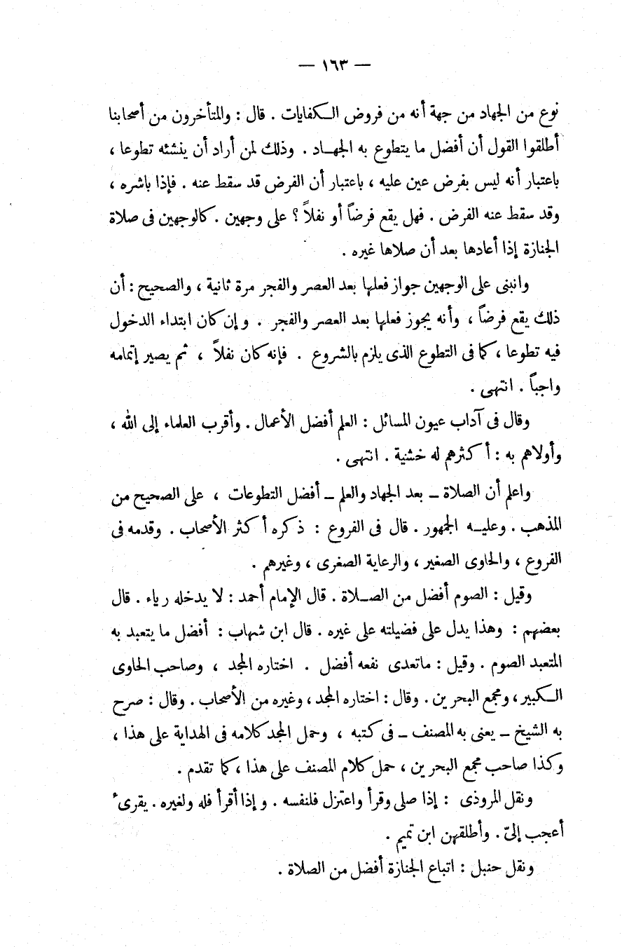 قَالَ: وَالْمُتَأَخِّرُونَ مِنْ أَصْحَابِنَا أَطْلَقُوا الْقَوْلَ أَنَّ أَفْضَلَ مَا يُتَطَوَّعُ بِهِ الْجِهَادُ، وَذَلِكَ لِمَنْ أَرَادَ أَنْ يُنْشِئَهُ تَطَوُّعًا، بِاعْتِبَارِ أَنَّهُ لَيْسَ بِفَرْضِ عَيْنٍ عَلَيْهِ، بِاعْتِبَارِ أَنَّ الْفَرْضَ قَدْ سَقَطَ عَنْهُ فَإِذَا بَاشَرَهُ، وَقَدْ سَقَطَ عَنْهُ الْفَرْضُ فَهَلْ يَقَعُ فَرْضًا أَوْ نَفْلًا؟ عَلَى وَجْهَيْنِ كَالْوَجْهَيْنِ فِي صَلَاةِ الْجِنَازَةِ إذَا أَعَادَهَا بَعْدَ أَنْ صَلَّاهَا غَيْرُهُ، وَانْبَنَى عَلَى الْوَجْهَيْنِ جَوَازُ فِعْلِهَا بَعْدَ الْعَصْرِ وَالْفَجْرِ مَرَّةً ثَانِيَةً، وَالصَّحِيحُ: أَنَّ ذَلِكَ يَقَعُ فَرْضًا، وَأَنَّهُ يَجُوزُ فِعْلُهَا بَعْدَ الْعَصْرِ وَالْفَجْرِ، وَإِنْ كَانَ ابْتِدَاءُ الدُّخُولِ فِيهِ تَطَوُّعًا. كَمَا فِي التَّطَوُّعِ الَّذِي يَلْزَمُ بِالشُّرُوعِ فَإِنَّهُ كَانَ نَفْلًا، ثُمَّ يَصِيرُ إتْمَامُهُ وَاجِبًا. انْتَهَى. وَقَالَ فِي آدَابِ عُيُونِ الْمَسَائِلِ: الْعِلْمُ أَفْضَلُ الْأَعْمَالِ، وَأَقْرَبُ الْعُلَمَاءِ إلَى اللَّهِ، وَأَوْلَاهُمْ بِهِ: أَكْثَرُهُمْ لَهُ خَشْيَةً. انْتَهَى.