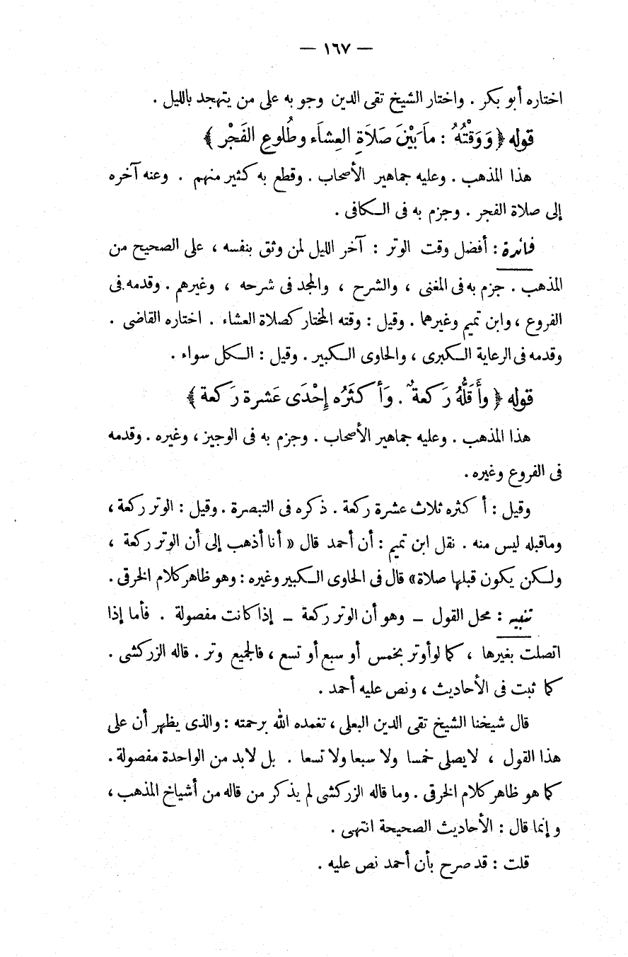 قَوْلُهُ (وَأَقَلُّهُ رَكْعَةٌ، وَأَكْثَرُهُ إحْدَى عَشْرَةَ رَكْعَةً) هَذَا الْمَذْهَبُ، وَعَلَيْهِ جَمَاهِيرُ الْأَصْحَابِ وَجَزَمَ بِهِ فِي الْوَجِيزِ، وَغَيْرِهِ وَقَدَّمَهُ فِي الْفُرُوعِ وَغَيْرِهِ، وَقِيلَ: أَكْثَرُهُ ثَلَاثَ عَشْرَةَ رَكْعَةً، ذَكَرَهُ فِي التَّبْصِرَةِ، وَقِيلَ: الْوِتْرُ رَكْعَةٌ، وَمَا قَبْلَهُ لَيْسَ مِنْهُ، نَقَلَ ابْنُ تَمِيمٍ: أَنَّ أَحْمَدَ قَالَ (أَنَا أَذْهَبُ إلَى أَنَّ الْوِتْرَ رَكْعَةٌ، وَلَكِنْ يَكُونُ قَبْلَهَا صَلَاةٌ) قَالَ فِي الْحَاوِي الْكَبِيرِ وَغَيْرِهِ: وَهُوَ ظَاهِرُ كَلَامِ الْخِرَقِيِّ. تَنْبِيهٌ: مَحَلُّ الْقَوْلِ وَهُوَ أَنَّ الْوِتْرَ رَكْعَةٌ إذَا كَانَتْ مَفْصُولَةً فَأَمَّا إذَا اتَّصَلَتْ بِغَيْرِهَا، كَمَا لَوْ أَوْتَرَ بِخَمْسٍ أَوْ سَبْعٍ أَوْ تِسْعٍ، فَالْجَمِيعُ وِتْرٌ، قَالَهُ الزَّرْكَشِيُّ كَمَا ثَبَتَ فِي الْأَحَادِيثِ، وَنَصَّ عَلَيْهِ أَحْمَدُ قَالَ شَيْخُنَا الشَّيْخُ تَقِيُّ الدِّينِ الْبَعْلِيُّ، تَغَمَّدَهُ اللَّهُ بِرَحْمَتِهِ: وَاَلَّذِي يَظْهَرُ أَنَّ عَلَى هَذَا الْقَوْلِ، لَا يُصَلِّي خَمْسًا وَلَا سَبْعًا وَلَا تِسْعًا بَلْ لَا بُدَّ مِنْ الْوَاحِدَةِ مَفْصُولَةً كَمَا هُوَ ظَاهِرُ كَلَامِ الْخِرَقِيِّ، وَمَا قَالَهُ الزَّرْكَشِيُّ لَمْ يَذْكُرْ مَنْ قَالَهُ مِنْ أَشْيَاخِ الْمَذْهَبِ، وَإِنَّمَا قَالَ: الْأَحَادِيثُ الصَّحِيحَةُ. انْتَهَى.