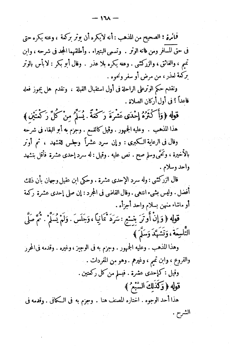 قَوْلُهُ (وَأَكْثَرُهُ إحْدَى عَشْرَةَ رَكْعَةً يُسَلِّمُ مِنْ كُلِّ رَكْعَتَيْنِ) هَذَا الْمَذْهَبُ، وَعَلَيْهِ الْجُمْهُورِ، وَقِيلَ كَالتِّسْعِ وَجَزَمَ بِهِ أَبُو الْبَقَاءِ فِي شَرْحِهِ وَقَالَ فِي الرِّعَايَةِ الْكُبْرَى: وَإِنْ سَرَدَ عَشْرًا وَجَلَسَ لِلتَّشَهُّدِ، ثُمَّ أَوْتَرَ بِالْأَخِيرَةِ، وَتَحَّى وَسَلَّمَ صَحَّ نَصَّ عَلَيْهِ، وَقِيلَ: لَهُ سَرْدُ إحْدَى عَشْرَةَ فَأَقَلَّ بِتَشَهُّدٍ وَاحِدٍ وَسَلَامٍ قَالَ الزَّرْكَشِيُّ: وَلَهُ سَرْدُ الْإِحْدَى عَشْرَةَ، وَحَكَى ابْنُ عَقِيلٍ وَجْهَانِ بِأَنَّ ذَلِكَ أَفْضَلُ، وَلَيْسَ بِشَيْءٍ. انْتَهَى. وَقَالَ الْقَاضِي فِي الْمُجَرَّدِ: إنْ صَلَّى إحْدَى عَشْرَةَ رَكْعَةً أَوْ مَا شَاءَ مِنْهُنَّ بِسَلَامٍ وَاحِدٍ أَجْزَأَهُ.