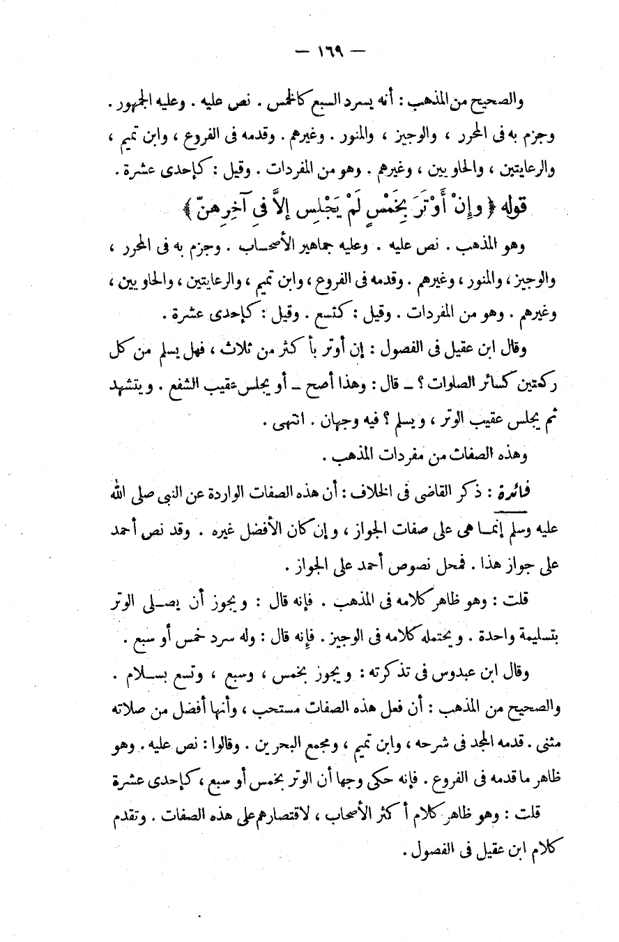 فَائِدَةٌ: ذَكَرَ الْقَاضِي فِي الْخِلَافِ: أَنَّ هَذِهِ الصِّفَاتِ الْوَارِدَةَ عَنْ النَّبِيِّ - صَلَّى اللَّهُ عَلَيْهِ وَسَلَّمَ - إنَّمَا هِيَ عَلَى صِفَاتِ الْجَوَازِ، وَإِنْ كَانَ الْأَفْضَلُ غَيْرَهُ، وَقَدْ نَصَّ أَحْمَدُ عَلَى جَوَازِ هَذَا فَمَحَلُّ نُصُوصِ أَحْمَدَ عَلَى الْجَوَازِ. قُلْت: وَهُوَ ظَاهِرُ كَلَامِهِ فِي الْمُذْهَبِ فَإِنَّهُ قَالَ: وَيَجُوزُ أَنْ يُصَلِّيَ الْوِتْرَ بِتَسْلِيمَةٍ وَاحِدَةٍ، وَيَحْتَمِلُهُ كَلَامُهُ فِي الْوَجِيزِ فَإِنَّهُ قَالَ: وَلَهُ سَرْدُ خَمْسٍ أَوْ سَبْعٍ، وَقَالَ ابْنُ عَبْدُوسٍ فِي تَذْكِرَتِهِ: وَيَجُوزُ بِخَمْسٍ، وَسَبْعٍ، وَتِسْعٍ بِسَلَامٍ وَالصَّحِيحُ مِنْ الْمَذْهَبِ: أَنَّ فِعْلَ هَذِهِ الصِّفَاتِ مُسْتَحَبٌّ، وَأَنَّهَا أَفْضَلُ مِنْ صَلَاتِهِ مَثْنَى قَدَّمَهُ الْمَجْدُ فِي شَرْحِهِ، وَابْنُ تَمِيمٍ، وَمَجْمَعُ الْبَحْرَيْنِ، وَقَالُوا: نَصَّ عَلَيْهِ، وَهُوَ ظَاهِرُ مَا قَدَّمَهُ فِي الْفُرُوعِ فَإِنَّهُ حَكَى وَجْهًا أَنَّ الْوِتْرَ بِخَمْسٍ أَوْ سَبْعٍ كَإِحْدَى عَشْرَةَ قُلْت: وَهُوَ ظَاهِرُ كَلَامِ أَكْثَرِ الْأَصْحَابِ، لِاقْتِصَارِهِمْ عَلَى هَذِهِ الصِّفَاتِ، وَتَقَدَّمَ كَلَامُ ابْنِ عَقِيلٍ فِي الْفُصُولِ،
