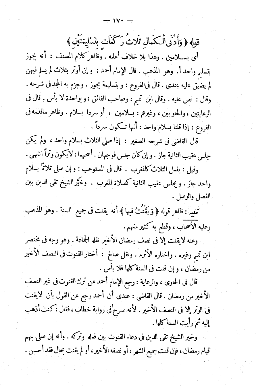 قَوْلُهُ (وَأَدْنَى الْكَمَالِ ثَلَاثُ رَكَعَاتٍ بِتَسْلِيمَتَيْنِ) أَيْ بِسَلَامَيْنِ، وَهَذَا بِلَا خِلَافٍ أَعْلَمُهُ وَظَاهِرُ كَلَامِ الْمُصَنِّفِ: أَنَّهُ يَجُوزُ بِتَسْلِيمٍ وَاحِدٍ، وَهُوَ الْمَذْهَبُ قَالَ الْإِمَامُ أَحْمَدُ: وَإِنْ أَوْتَرَ بِثَلَاثٍ لَمْ يُسَلِّمْ فِيهِنَّ لَمْ يَضِقْ عَلَيْهِ عِنْدِي قَالَ فِي الْفُرُوعِ: وَبِتَسْلِيمَةٍ يَجُوزُ وَجَزَمَ بِهِ الْمَجْدُ فِي شَرْحِهِ، وَقَالَ: نَصَّ عَلَيْهِ، وَقَالَ ابْنُ تَمِيمٍ، وَصَاحِبُ الْفَائِقِ: وَبِوَاحِدَةٍ لَا بَأْسَ.