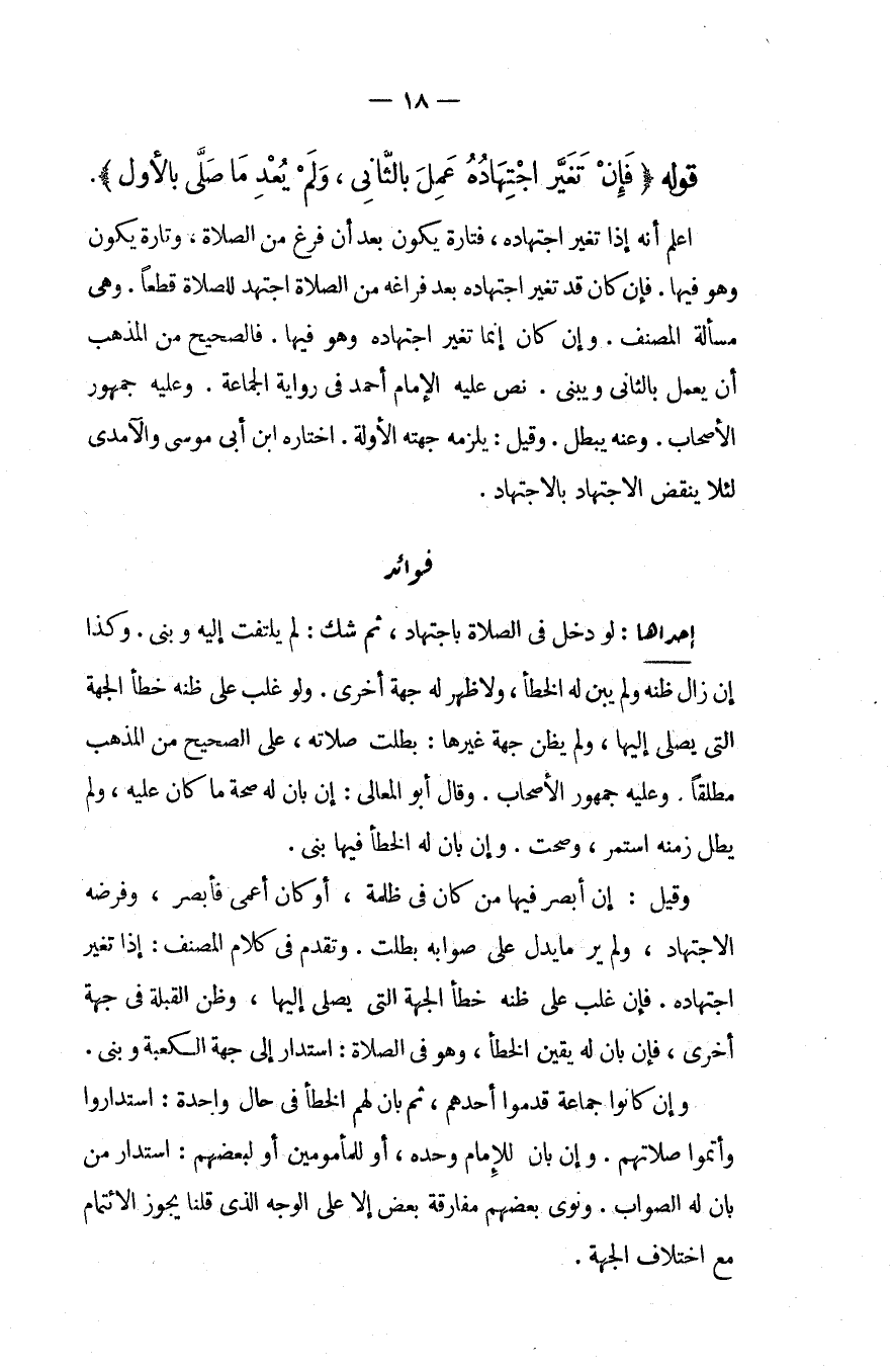 فَوَائِدُ. إحْدَاهَا: لَوْ دَخَلَ فِي الصَّلَاةِ بِاجْتِهَادٍ، ثُمَّ شَكَّ: لَمْ يَلْتَفِتْ إلَيْهِ وَبَنَى كَذَا إنْ زَالَ ظَنُّهُ وَلَمْ يَبِنْ لَهُ الْخَطَأُ، وَلَا ظَهَرَ لَهُ جِهَةٌ أُخْرَى، وَلَوْ غَلَبَ عَلَى ظَنِّهِ خَطَأُ الْجِهَةِ الَّتِي يُصَلِّي إلَيْهَا، وَلَمْ يَظُنَّ جِهَةً غَيْرَهَا: بَطَلَتْ صَلَاتُهُ، عَلَى الصَّحِيحِ مِنْ الْمَذْهَبِ مُطْلَقًا. وَعَلَيْهِ جُمْهُورُ الْأَصْحَابِ، وَقَالَ أَبُو الْمَعَالِي: إنْ بَانَ لَهُ صِحَّةُ مَا كَانَ عَلَيْهِ، وَلَمْ يَطُلْ زَمَنُهُ اسْتَمَرَّ، وَصَحَّتْ. وَإِنْ بَانَ لَهُ الْخَطَأُ فِيهَا بَنَى، وَقِيلَ: إنْ أَبْصَرَ فِيهَا مَنْ كَانَ فِي ظُلْمَةٍ، أَوْ كَانَ أَعْمَى فَأَبْصَرَ، وَفَرْضُهُ الِاجْتِهَادُ، وَلَمْ يَرَ مَا يَدُلُّ عَلَى صَوَابِهِ بَطَلَتْ، وَتَقَدَّمَ فِي كَلَامِ الْمُصَنِّفِ: إذَا تَغَيَّرَ اجْتِهَادُهُ فَإِنْ غَلَبَ عَلَى ظَنِّهِ خَطَأُ الْجِهَةِ الَّتِي يُصَلِّي إلَيْهَا، وَظَنَّ الْقِبْلَةَ فِي جِهَةٍ أُخْرَى، فَإِنْ بَانَ لَهُ يَقِينُ الْخَطَأِ، وَهُوَ فِي الصَّلَاةِ: اسْتَدَارَ إلَى جِهَةِ الْكَعْبَةِ وَبَنَى، وَإِنْ كَانُوا جَمَاعَةً قَدَّمُوا أَحَدَهُمْ، ثُمَّ بَانَ لَهُمْ الْخَطَأُ فِي حَالٍ وَاحِدَةٍ: اسْتَدَارُوا وَأَتَمُّوا صَلَاتَهُمْ، وَإِنْ بَانَ لِلْإِمَامِ وَحْدَهُ، أَوْ لِلْمَأْمُومِينَ أَوْ لِبَعْضِهِمْ: اسْتَدَارَ مَنْ بَانَ لَهُ الصَّوَابُ، وَنَوَى بَعْضُهُمْ مُفَارَقَةَ بَعْضٍ إلَّا عَلَى الْوَجْهِ الَّذِي قُلْنَا يَجُوزُ الِائْتِمَامُ مَعَ اخْتِلَافِ الْجِهَةِ