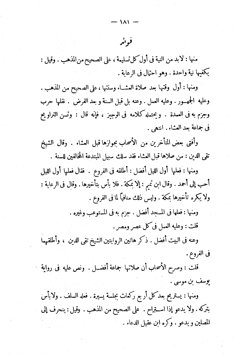 فَوَائِدُ. مِنْهَا: لَا بُدَّ مِنْ النِّيَّةِ فِي أَوَّلِ كُلِّ تَسْلِيمَةٍ، عَلَى الصَّحِيحِ مِنْ الْمَذْهَبِ، وَقِيلَ: يَكْفِيهَا نِيَّةٌ وَاحِدَةٌ، وَهُوَ احْتِمَالٌ فِي الرِّعَايَةِ، وَمِنْهَا: أَوَّلُ وَقْتِهَا بَعْدَ صَلَاةِ الْعِشَاءِ وَسُنَّتِهَا، عَلَى الصَّحِيحِ مِنْ الْمَذْهَبِ، وَعَلَيْهِ الْجُمْهُورُ، وَعَلَيْهِ الْعَمَلُ، وَعَنْهُ بَلْ قَبْلَ السُّنَّةِ وَبَعْدَ الْفَرْضِ، نَقَلَهَا حَرْبٌ وَجَزَمَ بِهِ فِي الْعُمْدَةِ، وَيَحْتَمِلُهُ كَلَامُهُ فِي الْوَجِيزِ، فَإِنَّهُ قَالَ: وَتُسَنُّ التَّرَاوِيحُ فِي جَمَاعَةٍ بَعْدَ الْعِشَاءِ. انْتَهَى. وَأَفْتَى بَعْضُ الْمُتَأَخِّرِينَ مِنْ الْأَصْحَابِ بِجَوَازِهَا قَبْلَ الْعِشَاءِ، وَقَالَ الشَّيْخُ تَقِيُّ الدِّينِ: مَنْ صَلَّاهَا قَبْلَ الْعِشَاءِ فَقَدْ سَلَكَ سَبِيلَ الْمُبْتَدَعَةِ الْمُخَالِفِينَ لِلسُّنَّةِ، وَمِنْهَا: فِعْلُهَا أَوَّلَ اللَّيْلِ أَفْضَلُ: أَطْلَقَهُ فِي الْفُرُوعِ فَقَالَ فِعْلُهَا أَوَّلَ اللَّيْلِ أَحَبُّ إلَى أَحْمَدَ، وَقَالَ ابْنُ تَمِيمٍ: إلَّا بِمَكَّةَ فَلَا بَأْسَ بِتَأْخِيرِهَا، وَقَالَ فِي الرِّعَايَةِ: وَلَا يُكْرَهُ تَأْخِيرُهَا بِمَكَّةَ، وَلَيْسَ ذَلِكَ مُنَافِيًا لَمَا فِي الْفُرُوعِ، وَمِنْهَا: فِعْلُهَا فِي الْمَسْجِدِ أَفْضَلُ جَزَمَ بِهِ فِي الْمُسْتَوْعِبِ وَغَيْرِهِ.