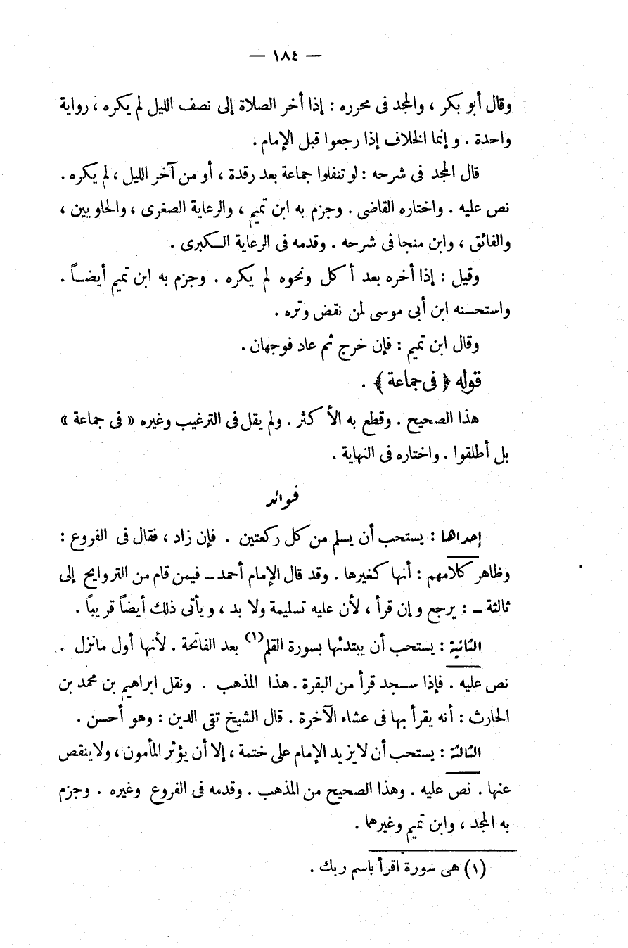الثَّانِيَةُ: يُسْتَحَبُّ أَنْ يَبْتَدِئَهَا بِسُورَةِ الْقَلَمِ بَعْدَ الْفَاتِحَةِ؛ لِأَنَّهَا أَوَّلُ مَا نَزَلَ نَصَّ عَلَيْهِ فَإِذَا سَجَدَ قَرَأَ مِنْ الْبَقَرَةِ، هَذَا الْمَذْهَبُ، وَنَقَلَ إبْرَاهِيمُ بْنُ مُحَمَّدِ بْنِ الْحَارِثِ: أَنَّهُ يَقْرَأُ بِهَا فِي عِشَاءِ الْآخِرَةِ قَالَ الشَّيْخُ تَقِيُّ الدِّينِ: وَهُوَ أَحْسَنُ.
