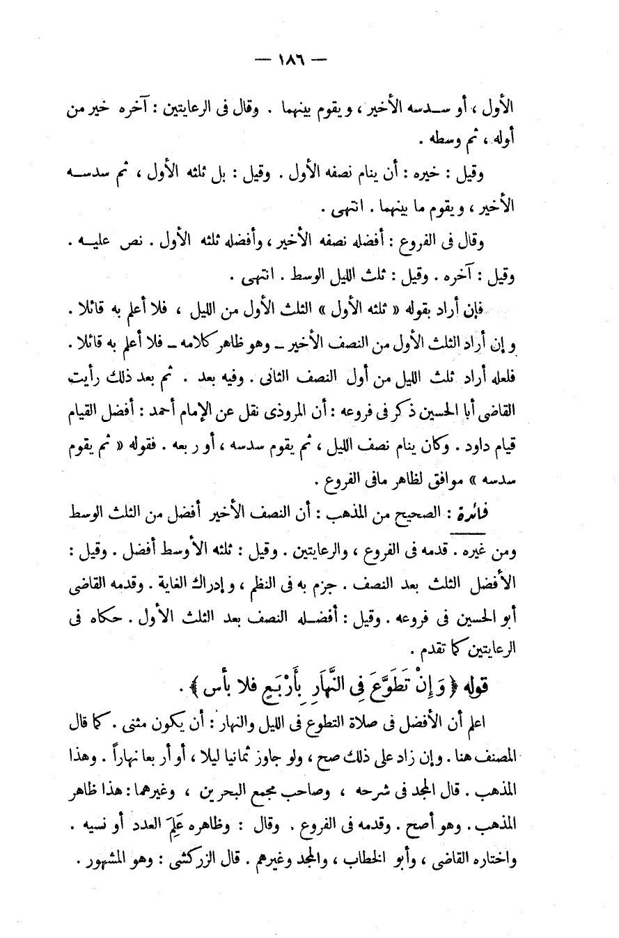 الْأَوَّلَ، أَوْ سُدُسَهُ الْأَخِيرَ، وَيَقُومَ بَيْنَهُمَا، وَقَالَ فِي الرِّعَايَتَيْنِ: آخِرُهُ خَيْرٌ مِنْ أَوَّلِهِ، ثُمَّ وَسَطُهُ، وَقِيلَ: خَيْرُهُ: أَنْ يَنَامَ نِصْفَهُ الْأَوَّلَ، وَقِيلَ: بَلْ ثُلُثُهُ الْأَوَّلُ، ثُمَّ سُدُسُهُ الْأَخِيرُ، وَيَقُومُ مَا بَيْنَهُمَا. انْتَهَى.، وَقَالَ فِي الْفُرُوعِ: أَفْضَلُهُ نِصْفُهُ الْأَخِيرُ، وَأَفْضَلُهُ ثُلُثُهُ الْأَوَّلُ نَصَّ عَلَيْهِ، وَقِيلَ: آخِرُهُ، وَقِيلَ: ثُلُثُ اللَّيْلِ الْوَسَطِ. انْتَهَى. فَإِنْ أَرَادَ بِقَوْلِهِ (ثُلُثَهُ الْأَوَّلَ) الثُّلُثَ الْأَوَّلَ مِنْ اللَّيْلِ، فَلَا أَعْلَمُ بِهِ قَائِلًا، وَإِنْ أَرَادَ الثُّلُثَ الْأَوَّلَ مِنْ النِّصْفِ الْأَخِيرِ وَهُوَ ظَاهِرُ كَلَامِهِ فَلَا أَعْلَمُ بِهِ قَائِلًا فَلَعَلَّهُ أَرَادَ ثُلُثَ اللَّيْلِ مِنْ أَوَّلِ النِّصْفِ الثَّانِي، وَفِيهِ بُعْدٌ ثُمَّ بَعْدَ ذَلِكَ رَأَيْت الْقَاضِيَ أَبَا الْحُسَيْنِ ذَكَرَ فِي فُرُوعِهِ: أَنَّ الْمَرُّوذِيَّ نَقَلَ عَنْ الْإِمَامِ أَحْمَدَ: أَفْضَلُ الْقِيَامِ قِيَامُ دَاوُد، وَكَانَ يَنَامُ نِصْفَ اللَّيْلِ، ثُمَّ يَقُومُ سُدُسَهُ، أَوْ رُبْعَهُ فَقَوْلُهُ " ثُمَّ يَقُومُ سُدُسَهُ " مُوَافِقٌ لِظَاهِرِ مَا فِي الْفُرُوعِ فَائِدَةٌ: الصَّحِيحُ مِنْ الْمَذْهَبِ: أَنَّ النِّصْفَ الْأَخِيرَ أَفْضَلُ مِنْ الثُّلُثِ الْوَسَطِ وَمِنْ غَيْرِهِ قَدَّمَهُ فِي الْفُرُوعِ، وَالرِّعَايَتَيْنِ، وَقِيلَ: ثُلُثُهُ الْأَوْسَطُ أَفْضَلُ، وَقِيلَ: الْأَفْضَلُ الثُّلُثُ بَعْدَ النِّصْفِ جَزَمَ بِهِ فِي النَّظْمِ، وَإِدْرَاكِ الْغَايَةِ وَقَدَّمَهُ الْقَاضِي أَبُو الْحُسَيْنِ فِي فُرُوعِهِ، وَقِيلَ: أَفْضَلُهُ النِّصْفُ بَعْدَ الثُّلُثِ الْأَوَّلِ، حَكَاهُ فِي الرِّعَايَتَيْنِ كَمَا تَقَدَّمَ.