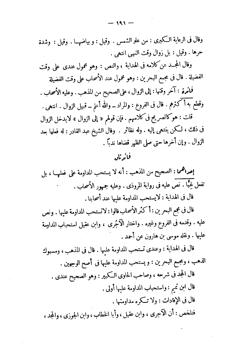 فَائِدَتَانِ. إحْدَاهُمَا: الصَّحِيحُ مِنْ الْمَذْهَبِ: أَنَّهُ لَا يُسْتَحَبُّ الْمُدَاوَمَةُ عَلَى فِعْلِهَا، بَلْ تُفْعَلُ غِبًّا نَصَّ عَلَيْهِ فِي رِوَايَةِ الْمَرُّوذِيِّ، وَعَلَيْهِ جُمْهُورُ الْأَصْحَابِ قَالَ فِي الْهِدَايَةِ: لَا يُسْتَحَبُّ الْمُدَاوَمَةُ عَلَيْهَا عِنْدَ أَصْحَابِنَا قَالَ فِي مَجْمَعِ الْبَحْرَيْنِ: أَكْثَرُ الْأَصْحَابِ قَالُوا: لَا تُسْتَحَبُّ الْمُدَاوَمَةُ عَلَيْهَا وَنَصَّ عَلَيْهِ وَقَدَّمَهُ فِي الْفُرُوعِ وَغَيْرِهِ وَاخْتَارَ الْآجُرِّيُّ، وَابْنُ عَقِيلٍ اسْتِحْبَابَ الْمُدَاوَمَةِ عَلَيْهَا، وَنَقَلَهُ مُوسَى بْنُ هَارُونَ عَنْ أَحْمَدَ قَالَ فِي الْهِدَايَةِ: وَعِنْدِي تُسْتَحَبُّ الْمُدَاوَمَةُ عَلَيْهَا قَالَ فِي الْمُذْهَبِ، وَمَسْبُوكِ الذَّهَبِ، وَمَجْمَعِ الْبَحْرَيْنِ: وَيُسْتَحَبُّ الْمُدَاوَمَةُ عَلَيْهَا فِي أَصَحِّ الْوَجْهَيْنِ قَالَ الْمَجْدُ فِي شَرْحِهِ، وَصَاحِبُ الْحَاوِي الْكَبِيرِ: وَهُوَ الصَّحِيحُ عِنْدِي قَالَ ابْنُ تَمِيمٍ: وَاسْتِحْبَابُ الْمُدَاوَمَةِ عَلَيْهَا أَوْلَى قَالَ فِي الْإِفَادَاتِ: وَلَا تُكْرَهُ مُدَاوَمَتُهَا.