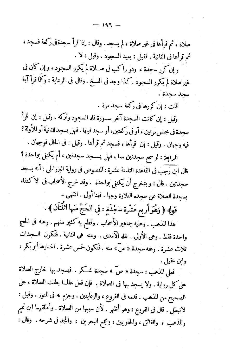 قَوْلُهُ (وَهُوَ أَرْبَعَ عَشْرَةَ سَجْدَةً) (فِي الْحَجِّ مِنْهَا اثْنَتَانِ) هَذَا الْمَذْهَبُ، وَعَلَيْهِ جَمَاهِيرُ الْأَصْحَابِ وَقَطَعَ بِهِ كَثِيرٌ مِنْهُمْ، وَعَنْهُ فِي الْحَجِّ وَاحِدَةٌ فَقَطْ، وَهِيَ الْأُولَى نَقَلَهُ الْآمِدِيُّ، وَعَنْهُ هِيَ الثَّانِيَةُ فَتَكُونُ السَّجَدَاتُ ثَلَاثَ عَشْرَةَ، وَعَنْهُ سَجْدَةُ (ص) مِنْهُ فَتَكُونُ خَمْسَ عَشْرَةَ اخْتَارَهَا أَبُو بَكْرٍ، وَابْنُ عَقِيلٍ فَعَلَى الْمَذْهَبِ: سَجْدَةُ (ص) سَجْدَةُ شُكْرٍ فَيَسْجُدُ بِهَا خَارِجَ الصَّلَاةِ عَلَى كُلِّ رِوَايَةٍ، وَلَا يَسْجُدُ بِهَا فِي الصَّلَاةِ فَإِنْ فَعَلَ عَالِمًا بَطَلَتْ الصَّلَاةُ، عَلَى الصَّحِيحِ مِنْ الْمَذْهَبِ قَدَّمَهُ فِي الْفُرُوعِ، وَالرِّعَايَتَيْنِ، وَجَزَمَ بِهِ فِي الْمُنَوِّرِ، وَقِيلَ: لَا تَبْطُلُ قَالَ فِي الْفُرُوعِ: وَهُوَ أَظْهَرُ؛ لِأَنَّ سَبَبَهَا مِنْ الصَّلَاةِ وَأَطْلَقَهُمَا ابْنُ تَمِيمٍ وَالْمُذْهَبُ، وَالْفَائِقُ، وَالْحَاوِيَيْنِ، وَمَجْمَعُ الْبَحْرَيْنِ، وَالْمَجْدُ فِي شَرْحِهِ، وَقَالَ: