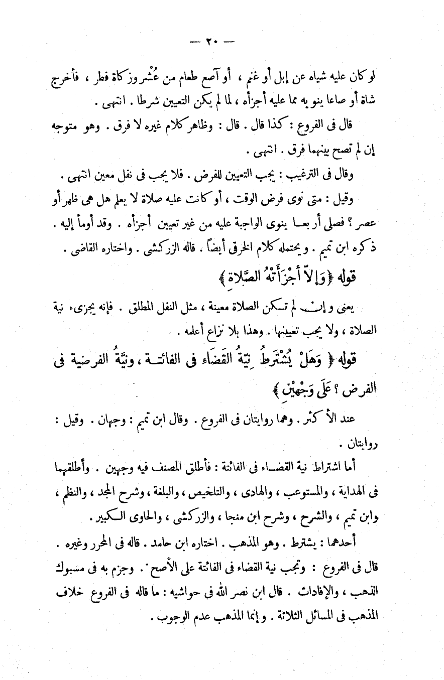 قَوْلُهُ (وَهَلْ يُشْتَرَطُ نِيَّةُ الْقَضَاءِ فِي الْفَائِتَةِ، وَنِيَّةُ الْفَرْضِيَّةِ فِي الْفَرْضِ؟ عَلَى وَجْهَيْنِ) عِنْدَ الْأَكْثَرِ، وَهُمَا رِوَايَتَانِ فِي الْفُرُوعِ، وَقَالَ ابْنُ تَمِيمٍ: وَجْهَانِ، وَقِيلَ: رِوَايَتَانِ أَمَّا اشْتِرَاطُ نِيَّةِ الْقَضَاءِ فِي الْفَائِتَةِ: فَأَطْلَقَ الْمُصَنِّفُ فِيهِ وَجْهَيْنِ، وَأَطْلَقَهُمَا فِي الْهِدَايَةِ، وَالْمُسْتَوْعِبِ، وَالْهَادِي، وَالتَّلْخِيصِ، وَالْبُلْغَةِ، وَشَرْحِ الْمَجْدِ، وَالنَّظْمِ، وَابْنُ تَمِيمٍ، وَالشَّرْحِ، وَشَرْحِ ابْنِ مُنَجَّى، وَالزَّرْكَشِيُّ، وَالْحَاوِي الْكَبِيرِ. أَحَدُهُمَا: يُشْتَرَطُ، وَهُوَ الْمَذْهَبُ اخْتَارَهُ ابْنُ حَامِدٍ، قَالَهُ فِي الْمُحَرَّرِ وَغَيْرِهِ قَالَ فِي الْفُرُوعِ: وَتَجِبُ نِيَّةُ الْقَضَاءِ فِي الْفَائِتَةِ عَلَى الْأَصَحِّ وَجَزَمَ بِهِ فِي مَسْبُوكِ الذَّهَبِ، وَالْإِفَادَاتِ قَالَ ابْنُ نَصْرِ اللَّهِ فِي حَوَاشِيهِ: مَا قَالَهُ فِي الْفُرُوعِ خِلَافُ الْمَذْهَبِ فِي الْمَسَائِلِ الثَّلَاثَةِ، وَإِنَّمَا الْمَذْهَبُ عَدَمُ الْوُجُوبِ