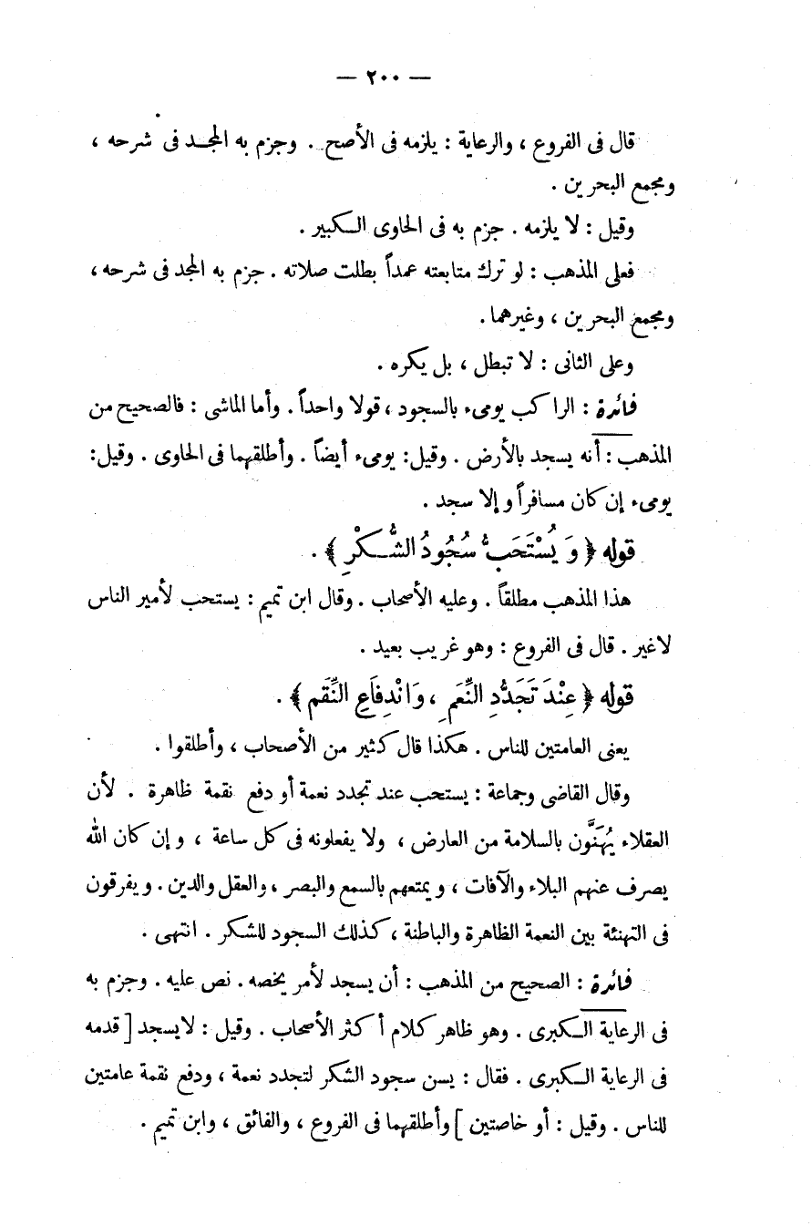 قَوْلُهُ (وَيُسْتَحَبُّ سُجُودُ الشُّكْرِ) هَذَا الْمَذْهَبُ مُطْلَقًا، وَعَلَيْهِ الْأَصْحَابُ، وَقَالَ ابْنُ تَمِيمٍ: يُسْتَحَبُّ لِأَمِيرِ النَّاسِ لَا غَيْرُ قَالَ فِي الْفُرُوعِ: وَهُوَ غَرِيبٌ بَعِيدٌ قَوْلُهُ (عِنْدَ تَجَدُّدِ النِّعَمِ، وَانْدِفَاعِ النِّقَمِ) يَعْنِي الْعَامَّتَيْنِ لِلنَّاسِ. هَكَذَا قَالَ كَثِيرٌ مِنْ الْأَصْحَابِ، وَأَطْلَقُوا، وَقَالَ الْقَاضِي وَجَمَاعَةٌ: يُسْتَحَبُّ عِنْدَ تَجَدُّدِ نِعْمَةٍ أَوْ دَفْعِ نِقْمَةٍ ظَاهِرَةٍ؛ لِأَنَّ الْعُقَلَاءَ يُهَنُّونَ بِالسَّلَامَةِ مِنْ الْعَارِضِ، وَلَا يَفْعَلُونَهُ فِي كُلِّ سَاعَةٍ، وَإِنْ كَانَ اللَّهُ يَصْرِفُ عَنْهُمْ الْبَلَاءَ وَالْآفَاتِ، وَيُمَتِّعُهُمْ بِالسَّمْعِ وَالْبَصَرِ، وَالْعَقْلِ وَالدِّينِ، وَيُفَرِّقُونَ فِي التَّهْنِئَةِ بَيْنَ النِّعْمَةِ الظَّاهِرَةِ وَالْبَاطِنَةِ، كَذَلِكَ السُّجُودُ لِلشُّكْرِ. انْتَهَى.