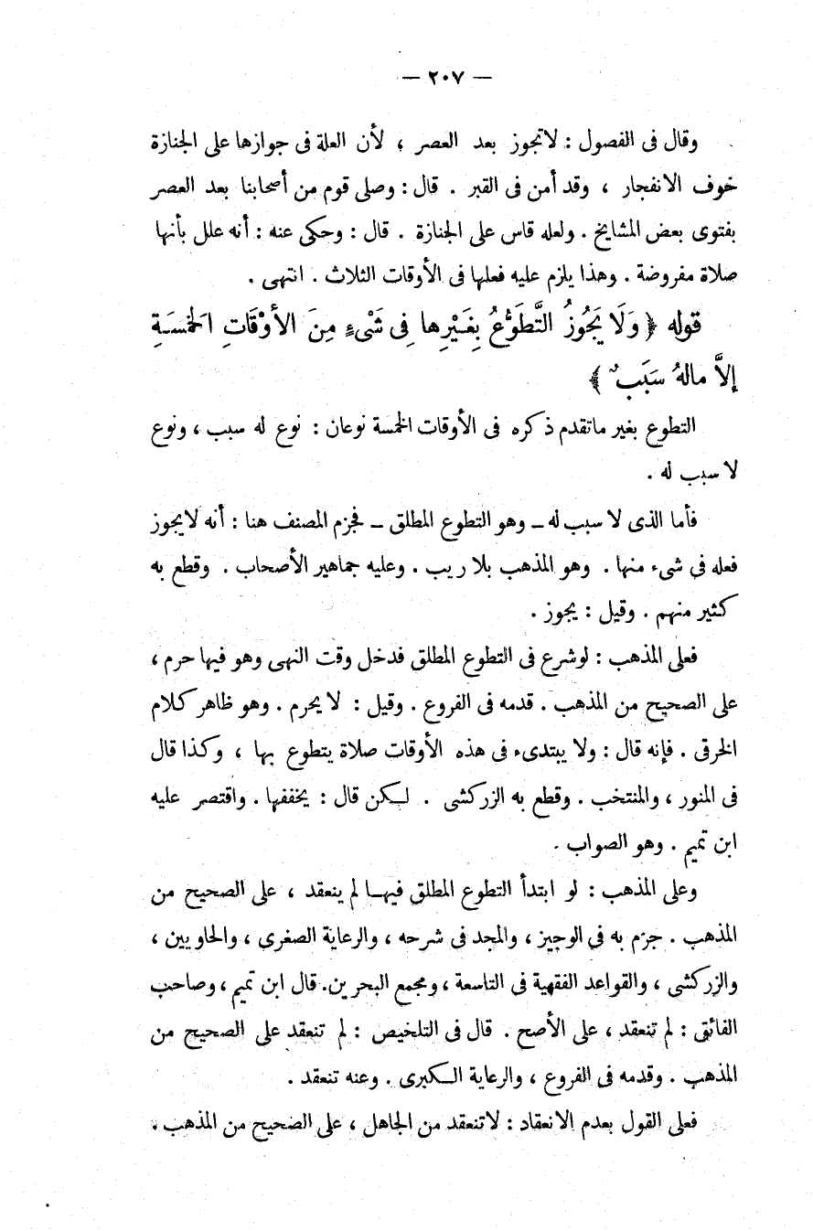 قَوْلُهُ (وَلَا يَجُوزُ التَّطَوُّعُ بِغَيْرِهَا فِي شَيْءٍ مِنْ الْأَوْقَاتِ الْخَمْسَةِ إلَّا مَا لَهُ سَبَبٌ) التَّطَوُّعُ بِغَيْرِ مَا تَقَدَّمَ ذِكْرُهُ فِي الْأَوْقَاتِ الْخَمْسَةِ نَوْعَانِ: نَوْعٌ لَهُ سَبَبٌ، وَنَوْعٌ لَا سَبَبَ لَهُ فَأَمَّا الَّذِي لَا سَبَبَ لَهُ وَهُوَ التَّطَوُّعُ الْمُطْلَقُ فَجَزَمَ الْمُصَنِّفُ هُنَا: أَنَّهُ لَا يَجُوزُ فِعْلُهُ فِي شَيْءٍ مِنْهَا وَهُوَ الْمَذْهَبُ بِلَا رَيْبٍ، وَعَلَيْهِ جَمَاهِيرُ الْأَصْحَابِ وَقَطَعَ بِهِ كَثِيرٌ مِنْهُمْ، وَقِيلَ: يَجُوزُ فَعَلَى الْمَذْهَبِ: لَوْ شَرَعَ فِي التَّطَوُّعِ الْمُطْلَقِ فَدَخَلَ وَقْتُ النَّهْيِ وَهُوَ فِيهَا حَرُمَ، عَلَى الصَّحِيحِ مِنْ الْمَذْهَبِ قَدَّمَهُ فِي الْفُرُوعِ، وَقِيلَ: لَا يَحْرُمُ، وَهُوَ ظَاهِرُ كَلَامِ الْخِرَقِيِّ، فَإِنَّهُ قَالَ: وَلَا يَبْتَدِئُ فِي هَذِهِ الْأَوْقَاتِ صَلَاةً يَتَطَوَّعُ بِهَا، وَكَذَا قَالَ فِي الْمُنَوِّرِ، وَالْمُنْتَخَبِ وَقَطَعَ بِهِ الزَّرْكَشِيُّ، لَكِنْ قَالَ: يُخَفِّفُهَا وَاقْتَصَرَ عَلَيْهِ ابْنُ تَمِيمٍ وَهُوَ الصَّوَابُ وَعَلَى الْمَذْهَبِ: لَوْ ابْتَدَأَ التَّطَوُّعَ الْمُطْلَقَ فِيهَا لَمْ يَنْعَقِدْ، عَلَى الصَّحِيحِ مِنْ الْمَذْهَبِ جَزَمَ بِهِ فِي الْوَجِيزِ، وَالْمَجْدُ فِي شَرْحِهِ، وَالرِّعَايَةُ الصُّغْرَى، وَالْحَاوِيَيْنِ، وَالزَّرْكَشِيُّ، وَالْقَوَاعِدِ الْفِقْهِيَّةِ فِي التَّاسِعَةِ، وَمَجْمَعِ الْبَحْرَيْنِ قَالَ ابْنُ تَمِيمٍ، وَصَاحِبُ الْفَائِقِ: لَمْ تَنْعَقِدْ، عَلَى الْأَصَحِّ قَالَ فِي التَّلْخِيصِ: لَمْ تَنْعَقِدْ عَلَى الصَّحِيحِ مِنْ الْمَذْهَبِ وَقَدَّمَهُ فِي الْفُرُوعِ، وَالرِّعَايَةِ الْكُبْرَى، وَعَنْهُ تَنْعَقِدُ فَعَلَى الْقَوْلِ بِعَدَمِ الِانْعِقَادِ: لَا تَنْعَقِدُ مِنْ الْجَاهِلِ، عَلَى الصَّحِيحِ مِنْ الْمَذْهَبِ.
