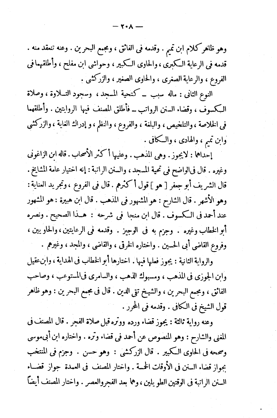 وَهُوَ ظَاهِرُ كَلَامِ ابْنِ تَمِيمٍ وَقَدَّمَهُ فِي الْفَائِقِ، وَمَجْمَعِ الْبَحْرَيْنِ، وَعَنْهُ تَنْعَقِدُ مِنْهُ قَدَّمَهُ فِي الرِّعَايَةِ الْكُبْرَى، وَالْحَاوِي الْكَبِيرِ، وَحَوَاشِي ابْنِ مُفْلِحٍ، وَأَطْلَقَهُمَا فِي الْفُرُوعِ، وَالرِّعَايَةِ الصُّغْرَى، وَالْحَاوِي الصَّغِيرِ، وَالزَّرْكَشِيُّ، النَّوْعُ الثَّانِي: مَا لَهُ سَبَبٌ كَتَحِيَّةِ الْمَسْجِدِ، وَسُجُودِ التِّلَاوَةِ، وَصَلَاةِ الْكُسُوفِ، وَقَضَاءِ السُّنَنِ الرَّوَاتِبِ فَأَطْلَقَ الْمُصَنِّفُ فِيهَا الرِّوَايَتَيْنِ وَأَطْلَقَهُمَا فِي الْخُلَاصَةِ، وَالتَّلْخِيصِ، وَالْبُلْغَةِ، وَالْفُرُوعِ، وَالنَّظْمِ، وَإِدْرَاكِ الْغَايَةِ، وَالزَّرْكَشِيُّ وَابْنُ تَمِيمٍ، وَالْهَادِي، وَالْكَافِي. إحْدَاهُمَا: لَا يَجُوزُ وَهِيَ الْمَذْهَبُ، وَعَلَيْهَا أَكْثَرُ الْأَصْحَابِ، قَالَهُ ابْنُ الزَّاغُونِيِّ وَغَيْرُهُ قَالَ فِي الْوَاضِحِ فِي تَحِيَّةِ الْمَسْجِدِ، وَالسُّنَنِ الرَّاتِبَةِ: إنَّهُ اخْتِيَارُ عَامَّةِ الْمَشَايِخِ قَالَ الشَّرِيفُ أَبُو جَعْفَرٍ (هُوَ) قَوْلُ أَكْثَرِهِمْ قَالَ فِي الْفُرُوعِ، وَتَجْرِيدِ الْعِنَايَةِ: وَهُوَ الْأَشْهَرُ قَالَ الشَّارِحُ: هُوَ الْمَشْهُورُ فِي الْمَذْهَبِ قَالَ ابْنُ هُبَيْرَةَ: هُوَ الْمَشْهُورُ عِنْدَ أَحْمَدَ فِي الْكُسُوفِ قَالَ ابْنُ مُنَجَّا فِي شَرْحِهِ: هَذَا الصَّحِيحُ وَنَصَرَهُ أَبُو الْخَطَّابِ وَغَيْرُهُ وَجَزَمَ بِهِ فِي الْوَجِيزِ وَقَدَّمَهُ فِي الرِّعَايَتَيْنِ، وَالْحَاوِيَيْنِ، وَفُرُوعِ الْقَاضِي أَبِي الْحُسَيْنِ وَاخْتَارَهُ الْخِرَقِيُّ، وَالْقَاضِي، وَالْمَجْدُ، وَغَيْرُهُمْ.