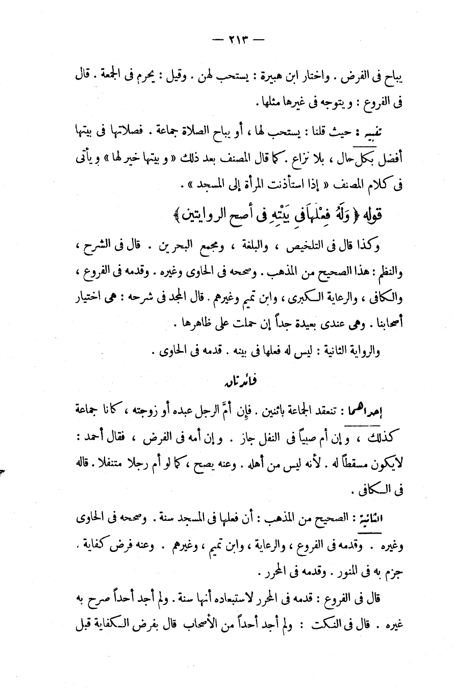 تَنْبِيهٌ: حَيْثُ قُلْنَا: يُسْتَحَبُّ لَهَا، أَوْ يُبَاحُ الصَّلَاةُ جَمَاعَةً فَصَلَاتُهَا فِي بَيْتِهَا أَفْضَلُ بِكُلِّ حَالٍ، بِلَا نِزَاعٍ قَالَ الْمُصَنِّفُ بَعْدَ ذَلِكَ (وَبَيْتُهَا خَيْرٌ لَهَا) وَيَأْتِي فِي كَلَامِ الْمُصَنِّفِ إذَا اسْتَأْذَنَتْ الْمَرْأَةُ إلَى الْمَسْجِدِ.