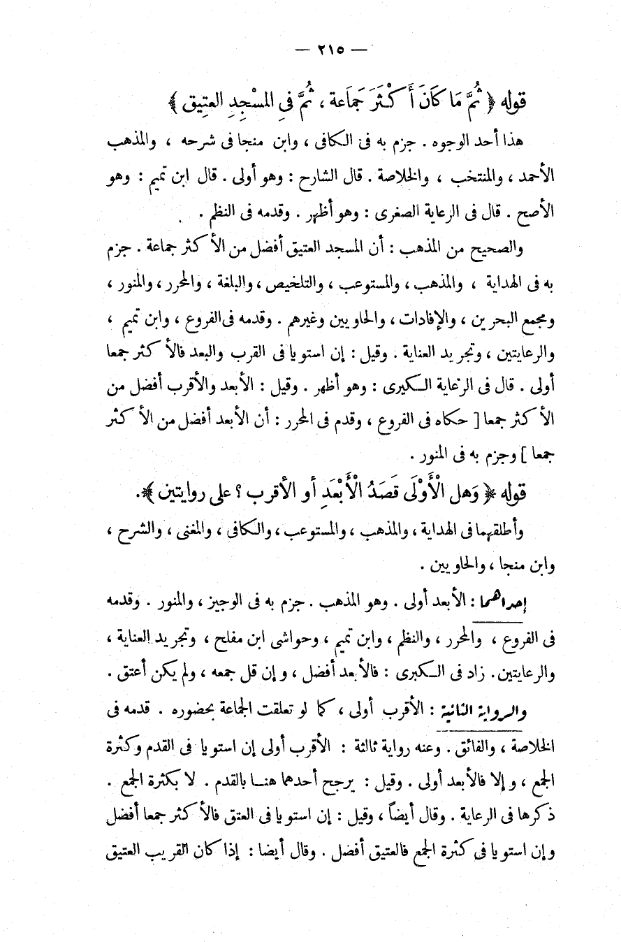 قَوْلُهُ (ثُمَّ مَا كَانَ أَكْثَرَ جَمَاعَةً، ثُمَّ فِي الْمَسْجِدِ الْعَتِيقِ) هَذَا أَحَدُ الْوُجُوهِ جَزَمَ بِهِ فِي الْكَافِي، وَابْنُ مُنَجَّا فِي شَرْحِهِ، وَالْمَذْهَبُ الْأَحْمَدُ، وَالْمُنْتَخَبُ، وَالْخُلَاصَةُ قَالَ الشَّارِحُ: وَهُوَ أَوْلَى قَالَ ابْنُ تَمِيمٍ: وَهُوَ الْأَصَحُّ قَالَ فِي الرِّعَايَةِ الصُّغْرَى: وَهُوَ أَظْهَرُ وَقَدَّمَهُ فِي النَّظْمِ وَالصَّحِيحُ مِنْ الْمَذْهَبِ: أَنَّ الْمَسْجِدَ الْعَتِيقَ أَفْضَلُ مِنْ الْأَكْثَرِ جَمَاعَةً جَزَمَ بِهِ فِي الْهِدَايَةِ، وَالْمُذْهَبِ، وَالْمُسْتَوْعِبِ، وَالتَّلْخِيصِ، وَالْبُلْغَةِ، وَالْمُحَرَّرِ، وَالْمُنَوِّرِ، وَمَجْمَعِ الْبَحْرَيْنِ، وَالْإِفَادَاتِ، وَالْحَاوِيَيْنِ وَغَيْرِهِمْ وَقَدَّمَهُ فِي الْفُرُوعِ، وَابْنُ تَمِيمٍ، وَالرِّعَايَتَيْنِ، وَتَجْرِيدِ الْعِنَايَةِ، وَقِيلَ: إنْ اسْتَوَيَا فِي الْقُرْبِ وَالْبُعْدِ فَالْأَكْثَرُ جَمْعًا أَوْلَى قَالَ فِي الرِّعَايَةِ الْكُبْرَى: وَهُوَ أَظْهَرُ، وَقِيلَ: الْأَبْعَدُ وَالْأَقْرَبُ أَفْضَلُ مِنْ الْأَكْثَرِ جَمْعًا [حَكَاهُ فِي الْفُرُوعِ، وَقَدَّمَ فِي الْمُحَرَّرِ: أَنَّ الْأَبْعَدَ أَفْضَلُ مِنْ الْأَكْثَرِ جَمْعًا] وَجَزَمَ بِهِ فِي الْمُنَوِّرِ قَوْلُهُ (وَهَلْ الْأَوْلَى قَصْدُ الْأَبْعَدِ أَوْ الْأَقْرَبِ؟) (عَلَى رِوَايَتَيْنِ) وَأَطْلَقَهُمَا فِي الْهِدَايَةِ، وَالْمُذْهَبِ، وَالْمُسْتَوْعِبِ، وَالْكَافِي، وَالْمُغْنِي، وَالشَّرْحِ، وَابْنِ مُنَجَّا، وَالْحَاوِيَيْنِ، إحْدَاهُمَا: الْأَبْعَدُ أَوْلَى وَهُوَ الْمَذْهَبُ جَزَمَ بِهِ فِي الْوَجِيزِ، وَالْمُنَوِّرِ وَقَدَّمَهُ فِي الْفُرُوعِ، وَالْمُحَرَّرِ، وَالنَّظْمِ، وَابْنُ تَمِيمٍ، وَحَوَاشِي ابْنِ مُفْلِحٍ، وَتَجْرِيدِ الْعِنَايَةِ، وَالرِّعَايَتَيْنِ، زَادَ فِي الْكُبْرَى: فَالْأَبْعَدُ أَفْضَلُ، وَإِنْ قَلَّ جَمْعُهُ، وَلَمْ يَكُنْ أَعْتَقَ، وَالرِّوَايَةُ الثَّانِيَةُ: الْأَقْرَبُ أَوْلَى كَمَا لَوْ تَعَلَّقَتْ الْجَمَاعَةُ بِحُضُورِهِ قَدَّمَهُ فِي الْخُلَاصَةِ، وَالْفَائِقِ، وَعَنْهُ رِوَايَةٌ ثَالِثَةٌ: الْأَقْرَبُ أَوْلَى إنْ اسْتَوَيَا فِي الْقِدَمِ وَكَثْرَةِ الْجَمْعِ، وَإِلَّا فَالْأَبْعَدُ أَوْلَى، وَقِيلَ: يُرَجَّحُ أَحَدُهُمَا هُنَا بِالْقِدَمِ لَا بِكَثْرَةِ الْجَمْعِ، ذَكَرَهَا فِي الرِّعَايَةِ، وَقَالَ أَيْضًا، وَقِيلَ: إنْ اسْتَوَيَا فِي الْعِتْقِ فَالْأَكْثَرُ جَمْعًا أَفْضَلُ وَإِنْ اسْتَوَيَا فِي كَثْرَةِ الْجَمْعِ فَالْعَتِيقُ أَفْضَلُ، وَقَالَ أَيْضًا: إذَا كَانَ الْقَرِيبُ الْعَتِيقَ