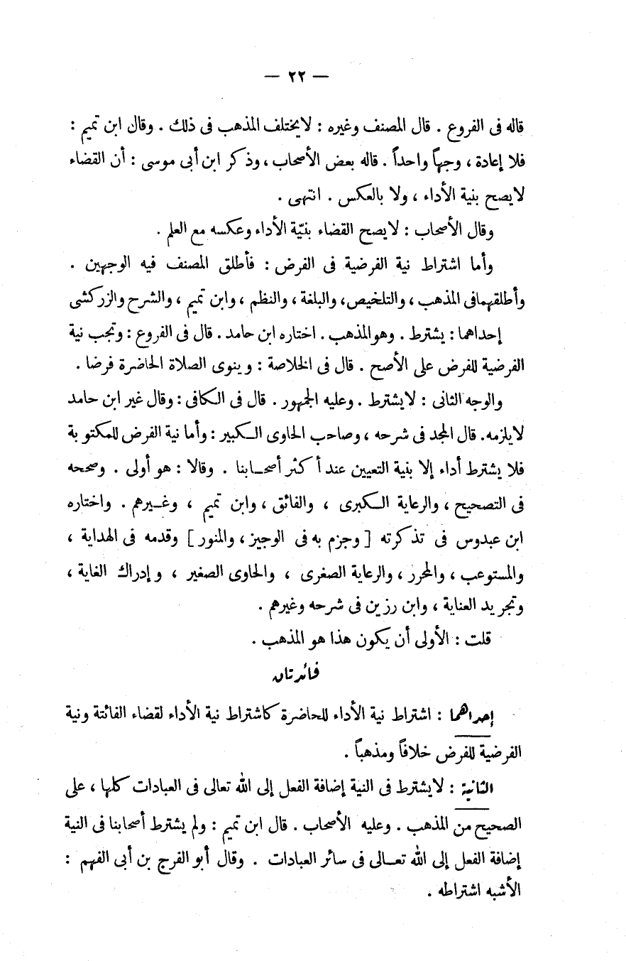 وَقَالَ الْأَصْحَابُ: لَا يَصِحُّ الْقَضَاءُ بِنِيَّةِ الْأَدَاءِ وَعَكْسُهُ مَعَ الْعِلْمِ، وَأَمَّا اشْتِرَاطُ نِيَّةِ الْفَرْضِيَّةِ فِي الْفَرْضِ: فَأَطْلَقَ الْمُصَنِّفُ فِيهِ الْوَجْهَيْنِ وَأَطْلَقَهُمَا فِي الْمُذْهَبِ، وَالتَّلْخِيصِ، وَالْبُلْغَةِ، وَالنَّظْمِ، وَابْنُ تَمِيمٍ، وَالشَّرْحِ وَالزَّرْكَشِيُّ إحْدَاهُمَا: يُشْتَرَطُ. وَهُوَ الْمَذْهَبُ اخْتَارَهُ ابْنُ حَامِدٍ قَالَ فِي الْفُرُوعِ: وَتَجِبُ نِيَّةُ الْفَرْضِيَّةِ لِلْفَرْضِ عَلَى الْأَصَحِّ قَالَ فِي الْخُلَاصَةِ: وَيَنْوِي الصَّلَاةَ الْحَاضِرَةَ فَرْضًا، وَالْوَجْهُ الثَّانِي: لَا يُشْتَرَطُ، وَعَلَيْهِ الْجُمْهُورُ. قَالَ فِي الْكَافِي: وَقَالَ غَيْرُ ابْنِ حَامِدٍ لَا يَلْزَمُهُ قَالَ الْمَجْدُ فِي شَرْحِهِ، وَصَاحِبُ الْحَاوِي الْكَبِيرِ: وَأَمَّا نِيَّةُ الْفَرْضِ لِلْمَكْتُوبَةِ فَلَا يُشْتَرَطُ أَدَاءٌ إلَّا بِنِيَّةِ التَّعْيِينِ عِنْدَ أَكْثَرِ أَصْحَابِنَا، وَقَالَا: هُوَ أَوْلَى وَصَحَّحَهُ فِي التَّصْحِيحِ، وَالرِّعَايَةِ الْكُبْرَى، وَالْفَائِقِ، وَابْنُ تَمِيمٍ، وَغَيْرُهُمْ وَاخْتَارَهُ ابْنُ عَبْدُوسٍ فِي تَذْكِرَتِهِ [وَجَزَمَ بِهِ فِي الْوَجِيزِ، وَالْمُنَوِّرِ] وَقَدَّمَهُ فِي الْهِدَايَةِ، وَالْمُسْتَوْعِبِ، وَالْمُحَرَّرِ، وَالرِّعَايَةِ الصُّغْرَى، وَالْحَاوِي الصَّغِيرِ، وَإِدْرَاكِ الْغَايَةِ، وَتَجْرِيدِ الْعِنَايَةِ، وَابْنُ رَزِينٍ فِي شَرْحِهِ وَغَيْرُهُمْ. قُلْت: الْأَوْلَى أَنْ يَكُونَ هَذَا هُوَ الْمَذْهَبُ