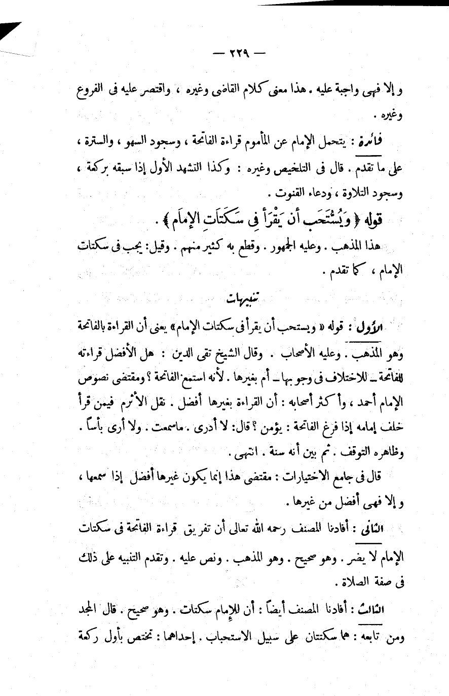 الثَّالِثُ: أَفَادَنَا الْمُصَنِّفُ أَيْضًا: أَنَّ لِلْإِمَامِ سَكَتَاتٍ، وَهُوَ صَحِيحٌ قَالَ الْمَجْدُ وَمَنْ تَابَعَهُ: هُمَا سَكْتَتَانِ عَلَى سَبِيلِ الِاسْتِحْبَابِ. إحْدَاهُمَا: تَخْتَصُّ بِأَوَّلِ رَكْعَةٍ