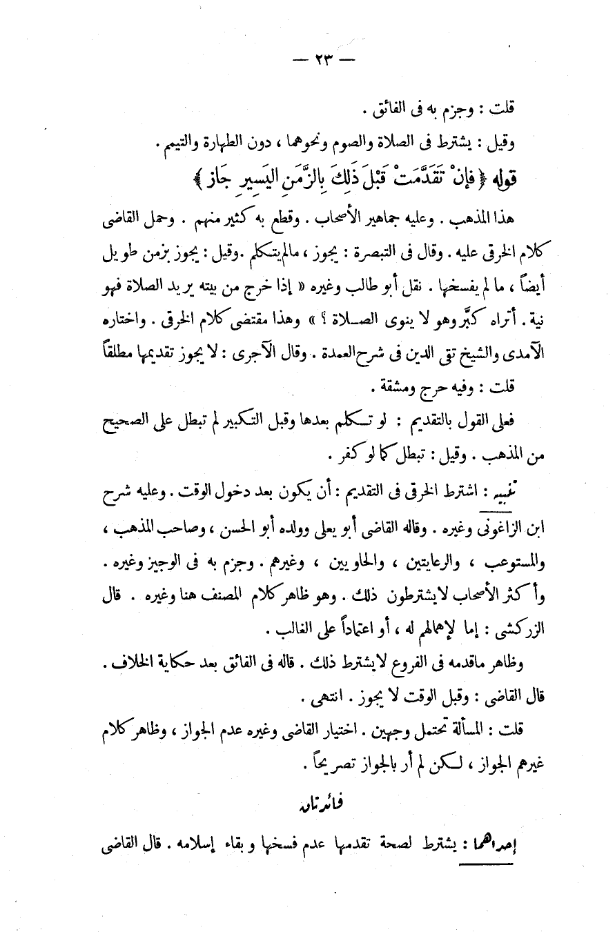 قُلْت: وَجَزَمَ بِهِ فِي الْفَائِقِ، وَقِيلَ: يُشْتَرَطُ فِي الصَّلَاةِ وَالصَّوْمِ وَنَحْوِهِمَا، دُونَ الطَّهَارَةِ وَالتَّيَمُّمِ قَوْلُهُ (فَإِنْ تَقَدَّمَتْ قَبْلَ ذَلِكَ بِالزَّمَنِ الْيَسِيرِ جَازَ) هَذَا الْمَذْهَبُ، وَعَلَيْهِ جَمَاهِيرُ الْأَصْحَابِ. وَقَطَعَ بِهِ كَثِيرٌ مِنْهُمْ، وَحَمَلَ الْقَاضِي كَلَامَ الْخِرَقِيِّ عَلَيْهِ، وَقَالَ فِي التَّبْصِرَةِ: يَجُوزُ، مَا لَمْ يَتَكَلَّمْ، وَقِيلَ: يَجُوزُ بِزَمَنٍ طَوِيلٍ أَيْضًا، مَا لَمْ يَفْسَخْهَا.