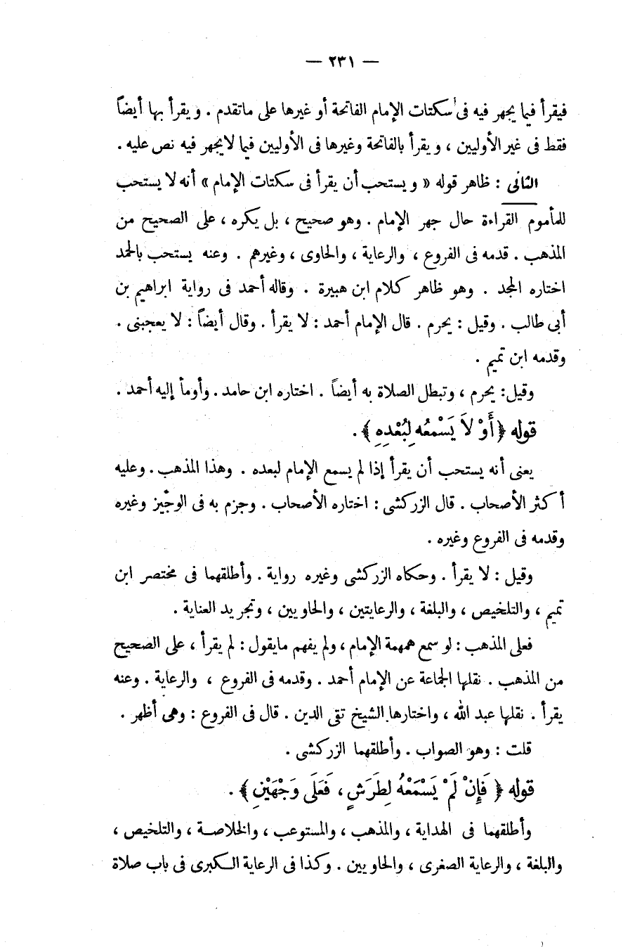 قَالَ الزَّرْكَشِيُّ: اخْتَارَهُ الْأَصْحَابُ وَجَزَمَ بِهِ فِي الْوَجِيزِ وَغَيْرِهِ وَقَدَّمَهُ فِي الْفُرُوعِ وَغَيْرِهِ، وَقِيلَ: لَا يَقْرَأُ، وَحَكَاهُ الزَّرْكَشِيُّ وَغَيْرُهُ رِوَايَةً، وَأَطْلَقَهُمَا فِي مُخْتَصَرِ ابْنِ تَمِيمٍ، وَالتَّلْخِيصِ، وَالْبُلْغَةِ، وَالرِّعَايَتَيْنِ، وَالْحَاوِيَيْنِ، وَتَجْرِيدِ الْعِنَايَةِ فَعَلَى الْمَذْهَبِ: لَوْ سَمِعَ هَمْهَمَةَ الْإِمَامِ، وَلَمْ يَفْهَمْ مَا يَقُولُ: لَمْ يَقْرَأْ، عَلَى الصَّحِيحِ مِنْ الْمَذْهَبِ نَقَلَهَا الْجَمَاعَةُ عَنْ الْإِمَامِ أَحْمَدَ وَقَدَّمَهُ فِي الْفُرُوعِ، وَالرِّعَايَةِ، وَعَنْهُ يَقْرَأُ، نَقَلَهَا عَبْدُ اللَّهِ، وَاخْتَارَهَا الشَّيْخُ تَقِيُّ الدِّينِ قَالَ فِي الْفُرُوعِ: وَهِيَ أَظْهَرُ قُلْت: وَهُوَ الصَّوَابُ، وَأَطْلَقَهُمَا الزَّرْكَشِيُّ قَوْلُهُ (فَإِنْ لَمْ يَسْمَعْهُ لِطَرَشٍ، فَعَلَى وَجْهَيْنِ) ، وَأَطْلَقَهُمَا فِي الْهِدَايَةِ، وَالْمُذْهَبِ، وَالْمُسْتَوْعِبِ، وَالْخُلَاصَةِ، وَالتَّلْخِيصِ، وَالْبُلْغَةِ، وَالرِّعَايَةِ الصُّغْرَى، وَالْحَاوِيَيْنِ، وَكَذَا فِي الرِّعَايَةِ الْكُبْرَى فِي بَابِ صَلَاةِ
