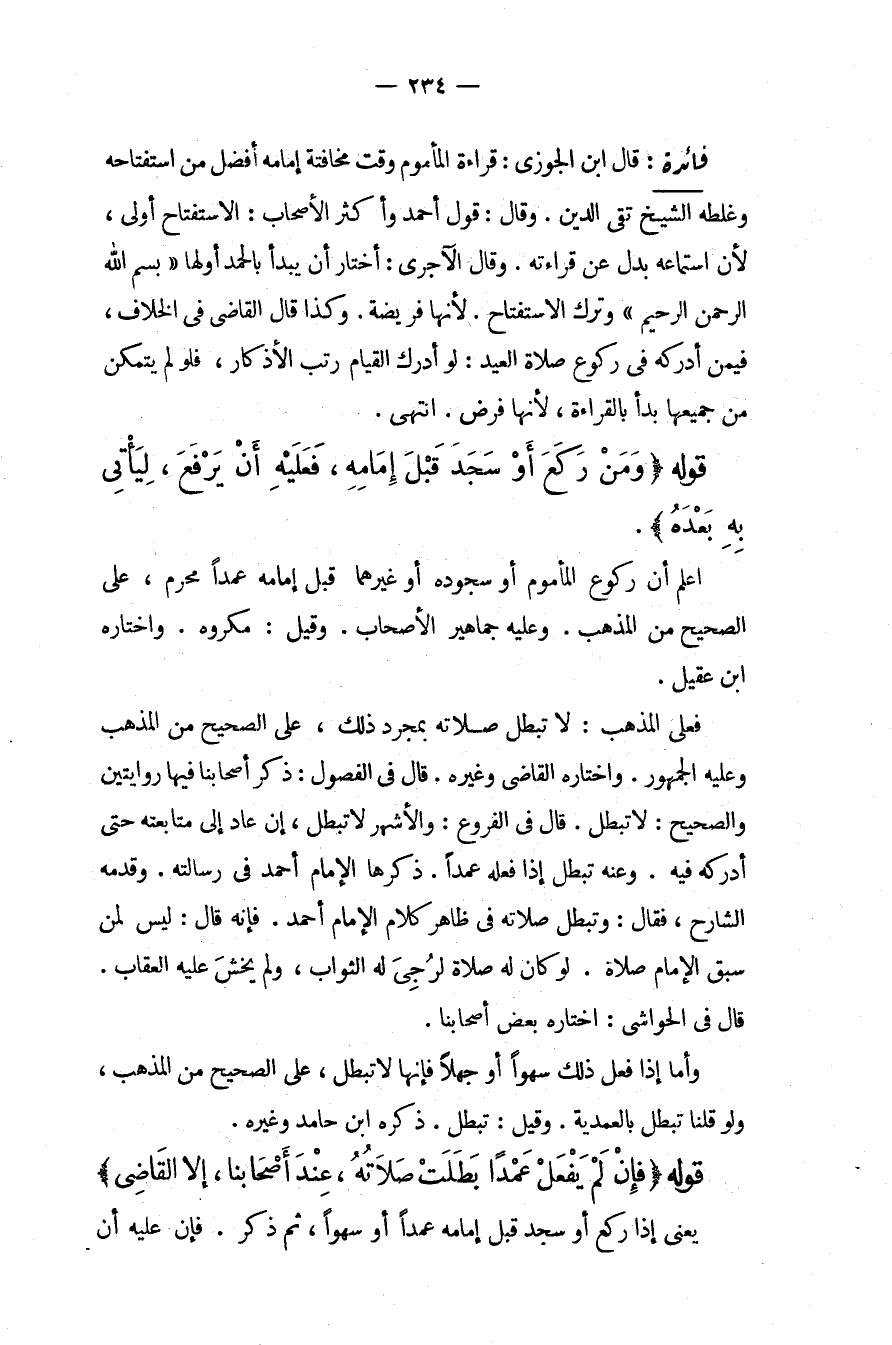 قَوْلُهُ (وَمَنْ رَكَعَ أَوْ سَجَدَ قَبْلَ إمَامِهِ، فَعَلَيْهِ أَنْ يَرْفَعَ، لِيَأْتِيَ بِهِ بَعْدَهُ) اعْلَمْ أَنَّ رُكُوعَ الْمَأْمُومِ أَوْ سُجُودَهُ أَوْ غَيْرَهُمَا قَبْلَ إمَامِهِ عَمْدًا مُحَرَّمٌ، عَلَى الصَّحِيحِ مِنْ الْمَذْهَبِ، وَعَلَيْهِ جَمَاهِيرُ الْأَصْحَابِ، وَقِيلَ: مَكْرُوهٌ وَاخْتَارَهُ ابْنُ عَقِيلٍ، فَعَلَى الْمَذْهَبِ: لَا تَبْطُلُ صَلَاتُهُ بِمُجَرَّدِ ذَلِكَ، عَلَى الصَّحِيحِ مِنْ الْمَذْهَبِ وَعَلَيْهِ الْجُمْهُورُ وَاخْتَارَهُ الْقَاضِي وَغَيْرُهُ قَالَ فِي الْفُصُولِ: ذَكَرَ أَصْحَابُنَا فِيهَا رِوَايَتَيْنِ وَالصَّحِيحُ: لَا تَبْطُلُ قَالَ فِي الْفُرُوعِ: وَالْأَشْهَرُ لَا تَبْطُلُ، إنْ عَادَ إلَى مُتَابَعَتِهِ حَتَّى أَدْرَكَهُ فِيهِ، وَعَنْهُ تَبْطُلُ إذَا فَعَلَهُ عَمْدًا، ذَكَرَهَا الْإِمَامُ أَحْمَدُ فِي رِسَالَتِهِ وَقَدَّمَهُ الشَّارِحُ، فَقَالَ: وَتَبْطُلُ صَلَاتُهُ فِي ظَاهِرِ كَلَامِ الْإِمَامِ أَحْمَدَ، فَإِنَّهُ قَالَ: لَيْسَ لِمَنْ سَبَقَ الْإِمَامَ صَلَاةٌ لَوْ كَانَ لَهُ صَلَاةٌ لَرُجِيَ لَهُ الثَّوَابُ، وَلَمْ يُخْشَ عَلَيْهِ الْعِقَابُ قَالَ فِي الْحَوَاشِي: اخْتَارَهُ بَعْضُ أَصْحَابِنَا، وَأَمَّا إذَا فَعَلَ ذَاكَ سَهْوًا أَوْ جَهْلًا فَإِنَّهَا لَا تَبْطُلُ، عَلَى الصَّحِيحِ مِنْ الْمَذْهَبِ، وَلَوْ قُلْنَا تَبْطُلُ بِالْعَمْدِيَّةِ، وَقِيلَ: تَبْطُلُ، ذَكَرَهُ ابْنُ حَامِدٍ وَغَيْرُهُ.