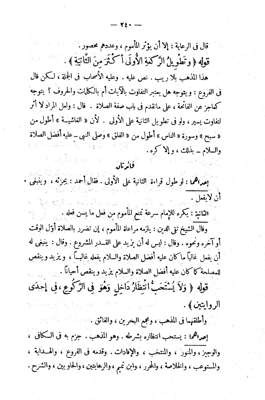 فَائِدَتَانِ إحْدَاهُمَا: لَوْ طَوَّلَ قِرَاءَةَ الثَّانِيَةِ عَلَى الْأُولَى فَقَالَ أَحْمَدُ: يُجْزِئُهُ، وَيَنْبَغِي أَنْ لَا يَفْعَلَ. الثَّانِيَةُ: يُكْرَهُ لِلْإِمَامِ سُرْعَةٌ تَمْنَعُ الْمَأْمُومَ مِنْ فِعْلِ مَا يُسَنُّ فِعْلُهُ، وَقَالَ الشَّيْخُ تَقِيُّ الدِّينِ: يَلْزَمُهُ مُرَاعَاةُ الْمَأْمُومِ، إنْ تَضَرَّرَ بِالصَّلَاةِ أَوَّلَ الْوَقْتِ أَوْ آخِرَهُ وَنَحْوُهُ، وَقَالَ: لَيْسَ لَهُ أَنْ يَزِيدَ عَلَى الْقَدْرِ الْمَشْرُوعِ.