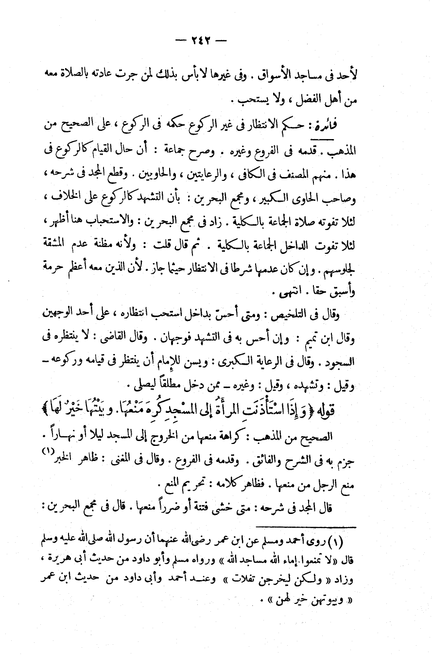 قَوْلُهُ (وَإِذَا اسْتَأْذَنَتْ الْمَرْأَةُ إلَى الْمَسْجِدِ كُرِهَ مَنْعُهَا، وَبَيْتُهَا خَيْرٌ لَهَا) الصَّحِيحُ مِنْ الْمَذْهَبِ: كَرَاهَةُ مَنْعِهَا مِنْ الْخُرُوجِ إلَى الْمَسْجِدِ لَيْلًا أَوْ نَهَارًا جَزَمَ بِهِ فِي الشَّرْحِ وَالْفَائِقِ وَقَدَّمَهُ فِي الْفُرُوعِ، وَقَالَ فِي الْمُغْنِي: ظَاهِرُ الْخَبَرِ