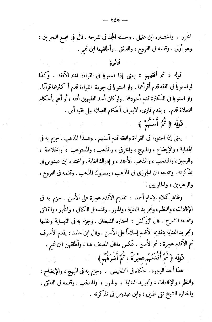 الْمُحَرَّرِ وَاخْتَارَهُ ابْنُ عَقِيلٍ، وَحَسَّنَهُ الْمَجْدُ فِي شَرْحِهِ قَالَ فِي مَجْمَعِ الْبَحْرَيْنِ: وَهُوَ أَوْلَى وَقَدَّمَهُ فِي الْفُرُوعِ، وَالْفَائِقِ، وَأَطْلَقَهُمَا ابْنُ تَمِيمٍ فَائِدَةٌ. قَوْلُهُ ثُمَّ أَفْقَهُهُمْ يَعْنِي إذَا اسْتَوَيَا فِي الْقِرَاءَةِ قُدِّمَ الْأَفْقَهُ، وَكَذَا لَوْ اسْتَوَيَا فِي الْفِقْهِ قُدِّمَ أَقْرَؤُهُمَا، وَلَوْ اسْتَوَيَا فِي جَوْدَةِ الْقِرَاءَةِ قُدِّمَ أَكْثَرُهُمَا قُرْآنًا، وَلَوْ اسْتَوَيَا فِي الْكَثْرَةِ قُدِّمَ أَجْوَدُهُمَا، وَلَوْ كَانَ أَحَدُ الْفَقِيهَيْنِ أَفْقَهَ، أَوْ أَعْلَمَ بِأَحْكَامِ الصَّلَاةِ قُدِّمَ، وَيُقَدَّمُ قَارِئٌ لَا يَعْرِفُ أَحْكَامَ الصَّلَاةِ عَلَى فَقِيهٍ أُمِّيٍّ. قَوْلُهُ (ثُمَّ أَسَنُّهُمْ) يَعْنِي إذَا اسْتَوَوْا فِي الْقِرَاءَةِ وَالْفِقْهِ قُدِّمَ أَسَنُّهُمْ، وَهَذَا الْمَذْهَبُ جَزَمَ بِهِ فِي الْهِدَايَةِ، وَالْإِيضَاحِ، وَالْمُبْهِجِ، وَالْخِرَقِيِّ، وَالْمُذْهَبِ، وَالْمُسْتَوْعِبِ، وَالْخُلَاصَةِ، وَالْوَجِيزِ، وَالْمُنْتَخَبِ، وَالْمَذْهَبِ الْأَحْمَدِ، وَإِدْرَاكِ الْغَايَةِ وَاخْتَارَهُ ابْنُ عَبْدُوسٍ فِي تَذْكِرَتِهِ.