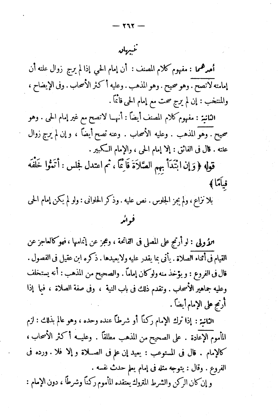 تَنْبِيهَانِ. أَحَدُهُمَا: مَفْهُومُ كَلَامِ الْمُصَنِّفِ: أَنَّ إمَامَ الْحَيِّ إذَا لَمْ يُرْجَ زَوَالُ عِلَّتِهِ أَنَّ إمَامَتَهُ لَا تَصِحُّ، وَهُوَ صَحِيحٌ، وَهُوَ الْمَذْهَبُ، وَعَلَيْهِ أَكْثَرُ الْأَصْحَابِ وَفِي الْإِيضَاحِ، وَالْمُنْتَخَبِ: إنْ لَمْ يُرْجَ صَحَّتْ مَعَ إمَامِ الْحَيِّ قَائِمًا. الثَّانِيَةُ: مَفْهُومُ كَلَامِ الْمُصَنِّفِ أَيْضًا: أَنَّهَا لَا تَصِحُّ مَعَ غَيْرِ إمَامِ الْحَيِّ، وَهُوَ صَحِيحٌ، وَهُوَ الْمَذْهَبُ، وَعَلَيْهِ الْأَصْحَابُ، وَعَنْهُ تَصِحُّ أَيْضًا، وَإِنْ لَمْ يُرْجَ زَوَالُ عِلَّتِهِ قَالَ فِي الْفَائِقِ: إلَّا إمَامَ الْحَيِّ، وَالْإِمَامَ الْكَبِيرَ قَوْلُهُ (وَإِنْ ابْتَدَأَ بِهِمْ الصَّلَاةَ قَائِمًا، ثُمَّ اعْتَدَلَ فَجَلَسَ: أَتَمُّوا خَلْفَهُ قِيَامًا) بِلَا نِزَاعٍ، وَلَمْ يَجُزْ الْجُلُوسُ نَصَّ عَلَيْهِ، وَذَكَرَ الْحَلْوَانِيّ: وَلَوْ لَمْ يَكُنْ إمَامَ الْحَيِّ.