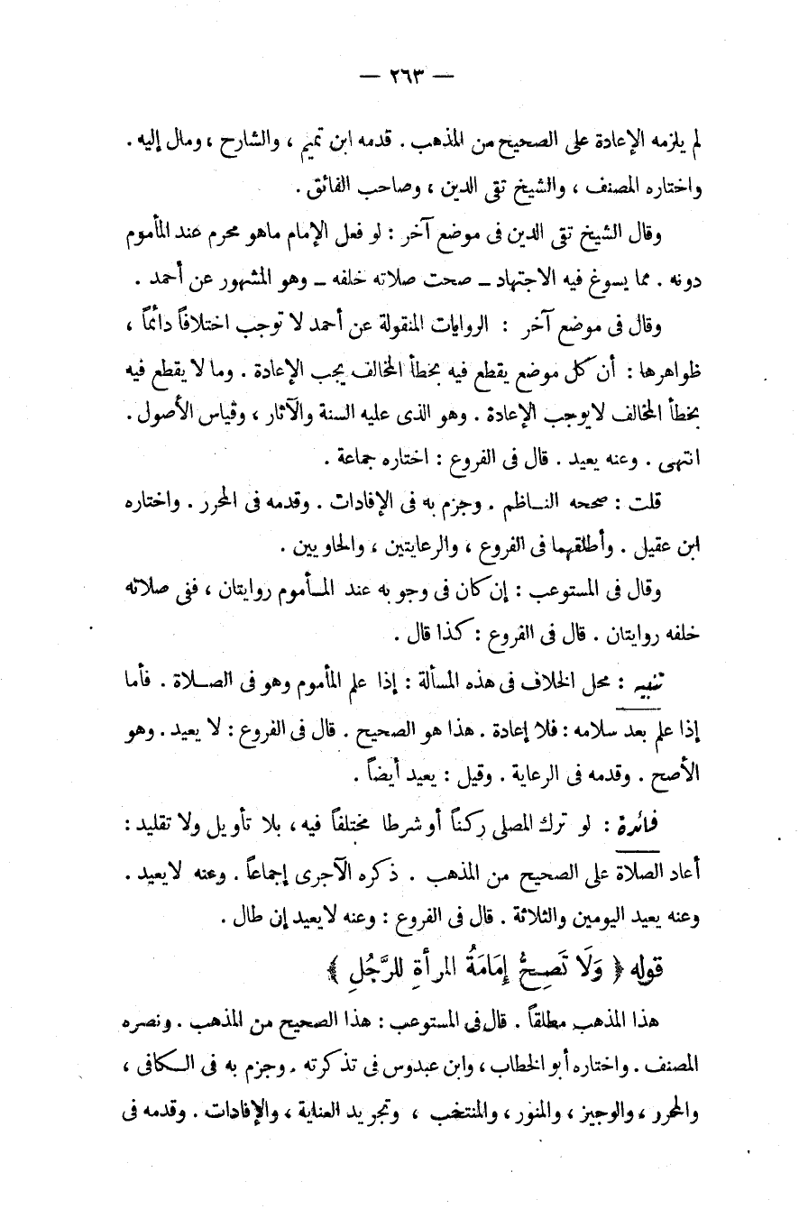 قَوْلُهُ (وَلَا تَصِحُّ إمَامَةُ الْمَرْأَةِ لِلرَّجُلِ) هَذَا الْمَذْهَبُ مُطْلَقًا قَالَ فِي الْمُسْتَوْعِبِ: هَذَا الصَّحِيحُ مِنْ الْمَذْهَبِ وَنَصَرَهُ الْمُصَنِّفُ وَاخْتَارَهُ أَبُو الْخَطَّابِ، وَابْنُ عَبْدُوسٍ فِي تَذْكِرَتِهِ وَجَزَمَ بِهِ فِي الْكَافِي، وَالْمُحَرَّرِ، وَالْوَجِيزِ، وَالْمُنَوِّرِ، وَالْمُنْتَخَبِ، وَتَجْرِيدِ الْعِنَايَةِ، وَالْإِفَادَاتِ وَقَدَّمَهُ فِي