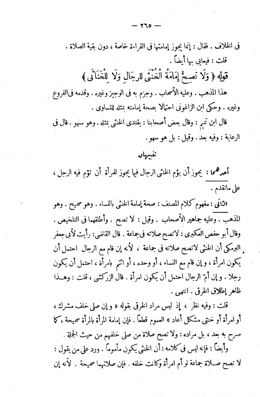 قَوْلُهُ (وَلَا تَصِحُّ إمَامَةُ الْخُنْثَى لِلرِّجَالِ وَلَا لِلْخَنَاثَى) هَذَا الْمَذْهَبُ، وَعَلَيْهِ الْأَصْحَابُ وَجَزَمَ بِهِ فِي الْوَجِيزِ وَغَيْرِهِ وَقَدَّمَهُ فِي الْفُرُوعِ وَغَيْرِهِ، وَحَكَى ابْنُ الزَّاغُونِيِّ احْتِمَالًا بِصِحَّةِ إمَامَتِهِ بِمِثْلِهِ لِلتَّسَاوِي قَالَ ابْنُ تَمِيمٍ: وَقَالَ بَعْضُ أَصْحَابِنَا: يَقْتَدِي الْخُنْثَى بِمِثْلِهِ، وَهُوَ سَهْوٌ قَالَ فِي الرِّعَايَةِ: وَفِيهِ بُعْدٌ، وَقِيلَ: بَلْ هُوَ سَهْوٌ. تَنْبِيهَانِ. أَحَدُهُمَا: يَجُوزُ أَنْ يَؤُمَّ الْخُنْثَى الرِّجَالَ فِيمَا يَجُوزُ لِلْمَرْأَةِ أَنْ تَؤُمَّ فِيهِ الرَّجُلَ، عَلَى مَا تَقَدَّمَ. الثَّانِي: مَفْهُومُ كَلَامِ الْمُصَنِّفِ: صِحَّةُ إمَامَةِ الْخُنْثَى بِالنِّسَاءِ. وَهُوَ صَحِيحٌ، وَهُوَ الْمَذْهَبُ، وَعَلَيْهِ جَمَاهِيرُ الْأَصْحَابِ، وَقِيلَ: لَا تَصِحُّ، وَأَطْلَقَهُمَا فِي التَّلْخِيصِ، وَقَالَ أَبُو حَفْصٍ الْعُكْبَرِيِّ: لَا تَصِحُّ صَلَاتُهُ فِي جَمَاعَةٍ قَالَ الْقَاضِي: رَأَيْت لِأَبِي جَعْفَرٍ الْبَرْمَكِيِّ أَنَّ الْخُنْثَى لَا تَصِحُّ صَلَاتُهُ فِي جَمَاعَةٍ، لِأَنَّهُ إنْ قَامَ مَعَ الرِّجَالِ احْتَمَلَ أَنْ يَكُونَ امْرَأَةً، وَإِنْ قَامَ مَعَ النِّسَاءِ، أَوْ وَحْدَهُ، أَوْ ائْتَمَّ بِامْرَأَةٍ، احْتَمَلَ أَنْ يَكُونَ رَجُلًا، وَإِنْ أَمَّ الرِّجَالَ احْتَمَلَ أَنْ يَكُونَ امْرَأَةً قَالَ الزَّرْكَشِيُّ، قُلْت: وَهَذَا ظَاهِرُ إطْلَاقِ الْخِرَقِيِّ، انْتَهَى قُلْت: وَفِيهِ نَظَرٌ، إذْ لَيْسَ مُرَادُ الْخِرَقِيِّ بِقَوْلِهِ " وَإِنْ صَلَّى خَلْفَ مُشْرِكٍ، أَوْ امْرَأَةٍ أَوْ خُنْثَى مُشْكِلٍ أَعَادَ " الْعُمُومَ قَطْعًا فَإِنَّ إمَامَةَ الْمَرْأَةِ بِالْمَرْأَةِ صَحِيحَةٌ، كَمَا صَرَّحَ بِهِ بَعْدُ، بَلْ مُرَادُهُ: وَلَا تَصِحُّ صَلَاةُ مَنْ صَلَّى خَلْفَهُمْ مِنْ حَيْثُ الْجُمْلَةُ وَأَيْضًا: فَإِنَّهُ لَيْسَ فِي كَلَامِهِ: أَنَّ الْخُنْثَى يَكُونُ مَأْمُومًا، وَرَدَّ عَلَى مَنْ يَقُولُ: لَا تَصِحُّ صَلَاةُ جَمَاعَةٍ لَوْ أَمَّ امْرَأَةٌ وَكَانَتْ خَلْفَهُ فَإِنَّ صَلَاتَهُمَا صَحِيحَةٌ؛ لِأَنَّهُ إنْ