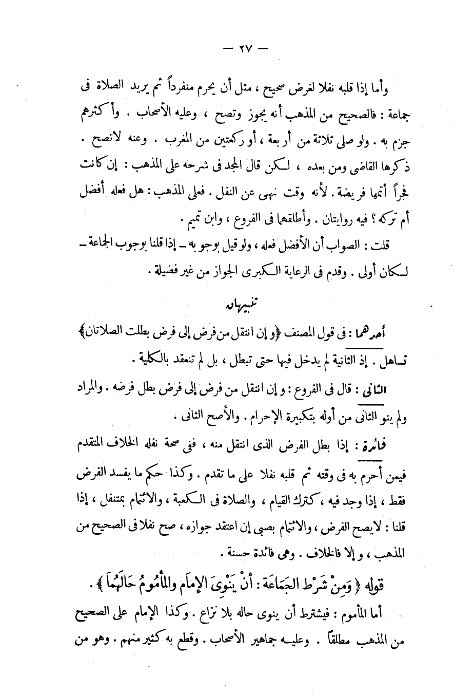 وَأَمَّا إذَا قَلَبَهُ نَفْلًا لِغَرَضٍ صَحِيحٍ، مِثْلُ أَنْ يُحْرِمَ مُنْفَرِدًا ثُمَّ يُرِيدُ الصَّلَاةَ فِي جَمَاعَةٍ: فَالصَّحِيحُ مِنْ الْمَذْهَبِ أَنَّهُ يَجُوزُ وَتَصِحُّ، وَعَلَيْهِ الْأَصْحَابُ، وَأَكْثَرُهُمْ جَزَمَ بِهِ، وَلَوْ صَلَّى ثَلَاثَةً مِنْ أَرْبَعَةٍ، أَوْ رَكْعَتَيْنِ مِنْ الْمَغْرِبِ، وَعَنْهُ لَا تَصِحُّ، ذَكَرَهَا الْقَاضِي وَمَنْ بَعْدَهُ، لَكِنْ قَالَ الْمَجْدُ فِي شَرْحِهِ عَلَى الْمُذْهَبِ: إنْ كَانَتْ فَجْرًا أَتَمَّهَا فَرِيضَةً؛ لِأَنَّهُ وَقْتُ نَهْيٍ عَنْ النَّفْلِ. فَعَلَى الْمَذْهَبِ: هَلْ فِعْلُهُ أَفْضَلُ أَمْ تَرْكُهُ؟ فِيهِ رِوَايَتَانِ، وَأَطْلَقَهُمَا فِي الْفُرُوعِ، وَابْنُ تَمِيمٍ، قُلْت: الصَّوَابُ أَنَّ الْأَفْضَلَ فِعْلُهُ، وَلَوْ قِيلَ بِوُجُوبِهِ إذَا قُلْنَا بِوُجُوبِ الْجَمَاعَةِ لَكَانَ أَوْلَى، وَقَدَّمَ فِي الرِّعَايَةِ الْكُبْرَى الْجَوَازَ مِنْ غَيْرِ فَضِيلَةٍ.