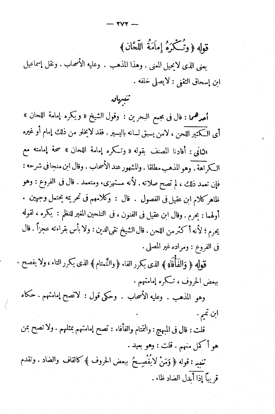 قَوْلُهُ (وَتُكْرَهُ إمَامَةُ اللَّحَّانِ) يَعْنِي الَّذِي لَا يُحِيلُ الْمَعْنَى، وَهَذَا الْمَذْهَبُ، وَعَلَيْهِ الْأَصْحَابُ، وَنَقَلَ إسْمَاعِيلُ بْنُ إِسْحَاقَ الثَّقَفِيُّ: لَا يُصَلَّى خَلْفَهُ. تَنْبِيهَانِ. إحْدَاهُمَا: قَالَ فِي مَجْمَعِ الْبَحْرَيْنِ: وَقَوْلُ الشَّيْخِ " وَيُكْرَهُ إمَامَةُ اللَّحَّانِ " أَيْ الْكَثِيرِ اللَّحْنِ، لَا مَنْ يَسْبِقُ لِسَانُهُ بِالْيَسِيرِ فَقَدْ لَا يَخْلُو مِنْ ذَلِكَ إمَامٌ أَوْ غَيْرُهُ. الثَّانِي: أَفَادَنَا الْمُصَنِّفُ بِقَوْلِهِ " وَتُكْرَهُ إمَامَةُ اللَّحَّانِ " صِحَّةُ إمَامَتِهِ مَعَ الْكَرَاهَةِ، وَهُوَ الْمَذْهَبُ مُطْلَقًا وَالْمَشْهُورُ عِنْدَ الْأَصْحَابِ.