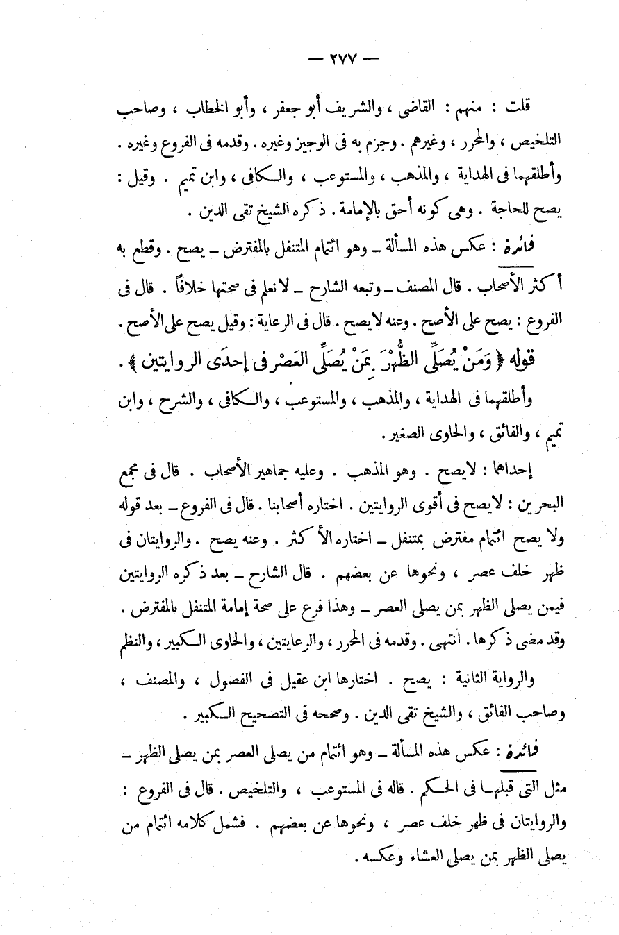 قُلْت: مِنْهُمْ: الْقَاضِي، وَالشَّرِيفُ أَبُو جَعْفَرٍ، وَأَبُو الْخَطَّابِ، وَصَاحِبُ التَّلْخِيصِ، وَالْمُحَرَّرِ، وَغَيْرُهُمْ وَجَزَمَ بِهِ فِي الْوَجِيزِ وَغَيْرِهِ. وَقَدَّمَهُ فِي الْفُرُوعِ وَغَيْرِهِ، وَأَطْلَقَهُمَا فِي الْهِدَايَةِ، وَالْمُذْهَبِ، وَالْمُسْتَوْعِبِ، وَالْكَافِي، وَابْنِ تَمِيمٍ، وَقِيلَ: يَصِحُّ لِلْحَاجَةِ، وَهِيَ كَوْنُهُ أَحَقَّ بِالْإِمَامَةِ، ذَكَرَهُ الشَّيْخُ تَقِيُّ الدِّينِ فَائِدَةٌ: عَكْسُ هَذِهِ الْمَسْأَلَةِ وَهُوَ ائْتِمَامُ الْمُتَنَفِّلِ بِالْمُفْتَرِضِ يَصِحُّ وَقَطَعَ بِهِ أَكْثَرُ الْأَصْحَابِ قَالَ الْمُصَنِّفُ وَتَبِعَهُ الشَّارِحُ لَا نَعْلَمُ فِي صِحَّتِهَا خِلَافًا قَالَ فِي الْفُرُوعِ: يَصِحُّ عَلَى الْأَصَحِّ، وَعَنْهُ لَا يَصِحُّ قَالَ فِي الرِّعَايَةِ: وَقِيلَ يَصِحُّ عَلَى الْأَصَحِّ.