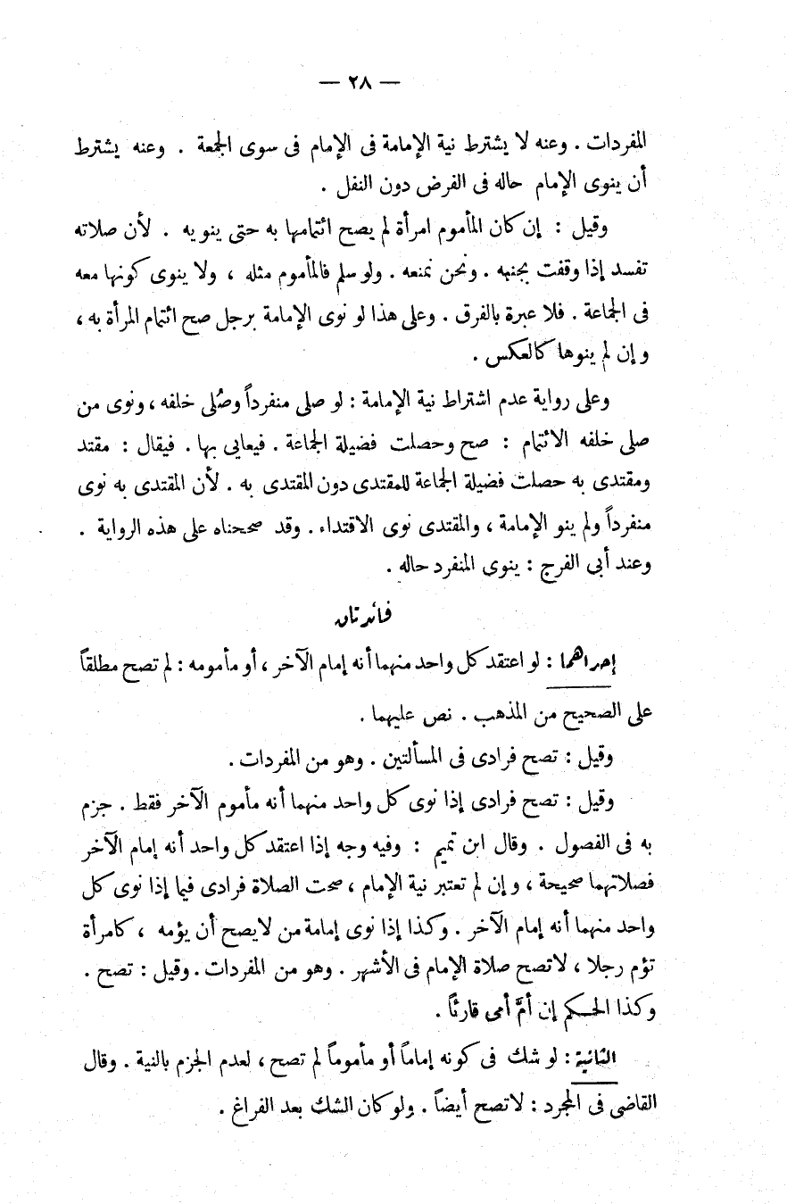 وَعَنْهُ لَا يُشْتَرَطُ نِيَّةُ الْإِمَامَةِ فِي الْإِمَامِ فِي سِوَى الْجُمُعَةِ، وَعَنْهُ يُشْتَرَطُ أَنْ يَنْوِيَ الْإِمَامُ فِي الْفَرْضِ دُونَ النَّفْلِ، وَقِيلَ: إنْ كَانَ الْمَأْمُومُ امْرَأَةً لَمْ يَصِحَّ ائْتِمَامُهَا بِهِ حَتَّى يَنْوِيَهُ؛ لِأَنَّ صَلَاتَهُ تَفْسُدُ إذَا وَقَفَتْ بِجَنْبِهِ، وَنَحْنُ نَمْنَعُهُ، وَلَوْ سُلِّمَ فَالْمَأْمُومُ مِثْلُهُ، وَلَا يَنْوِي كَوْنَهَا مَعَهُ فِي الْجَمَاعَةِ فَلَا عِبْرَةَ بِالْفَرْقِ.