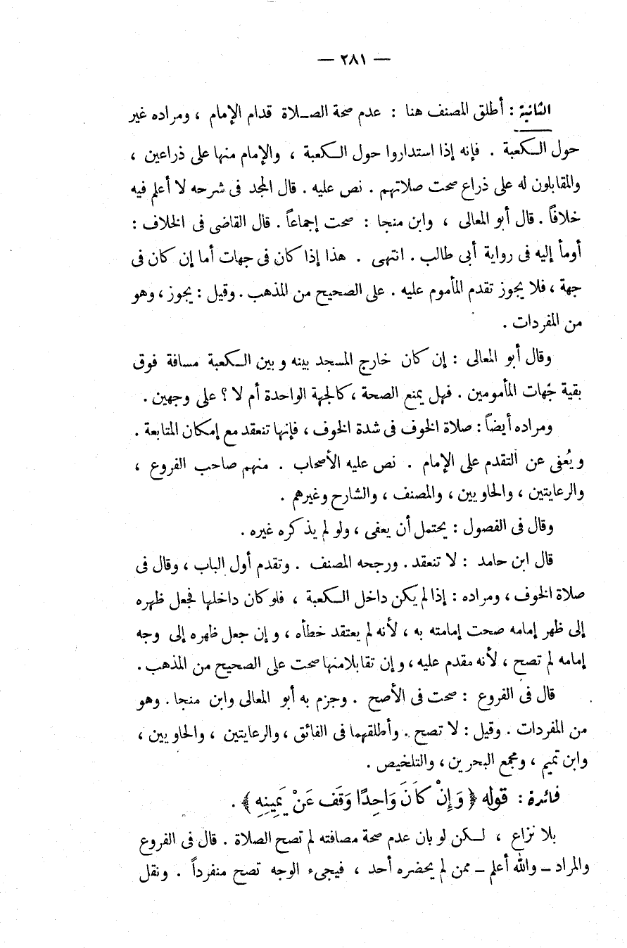 الثَّانِيَةُ: أَطْلَقَ الْمُصَنِّفُ هُنَا: عَدَمَ صِحَّةِ الصَّلَاةِ قُدَّامَ الْإِمَامِ، وَمُرَادُهُ غَيْرُ حَوْلِ الْكَعْبَةِ فَإِنَّهُ إذَا اسْتَدَارُوا حَوْلَ الْكَعْبَةِ، وَالْإِمَامُ مِنْهَا عَلَى ذِرَاعَيْنِ، وَالْمُقَابِلُونَ لَهُ عَلَى ذِرَاعٍ صَحَّتْ صَلَاتُهُمْ نَصَّ عَلَيْهِ قَالَ الْمَجْدُ فِي شَرْحِهِ لَا أَعْلَمُ فِيهِ خِلَافًا قَالَ أَبُو الْمَعَالِي، وَابْنُ مُنَجَّا: صَحَّتْ إجْمَاعًا قَالَ الْقَاضِي فِي الْخِلَافِ: أَوْمَأَ إلَيْهِ فِي رِوَايَةِ أَبِي طَالِبٍ. انْتَهَى.