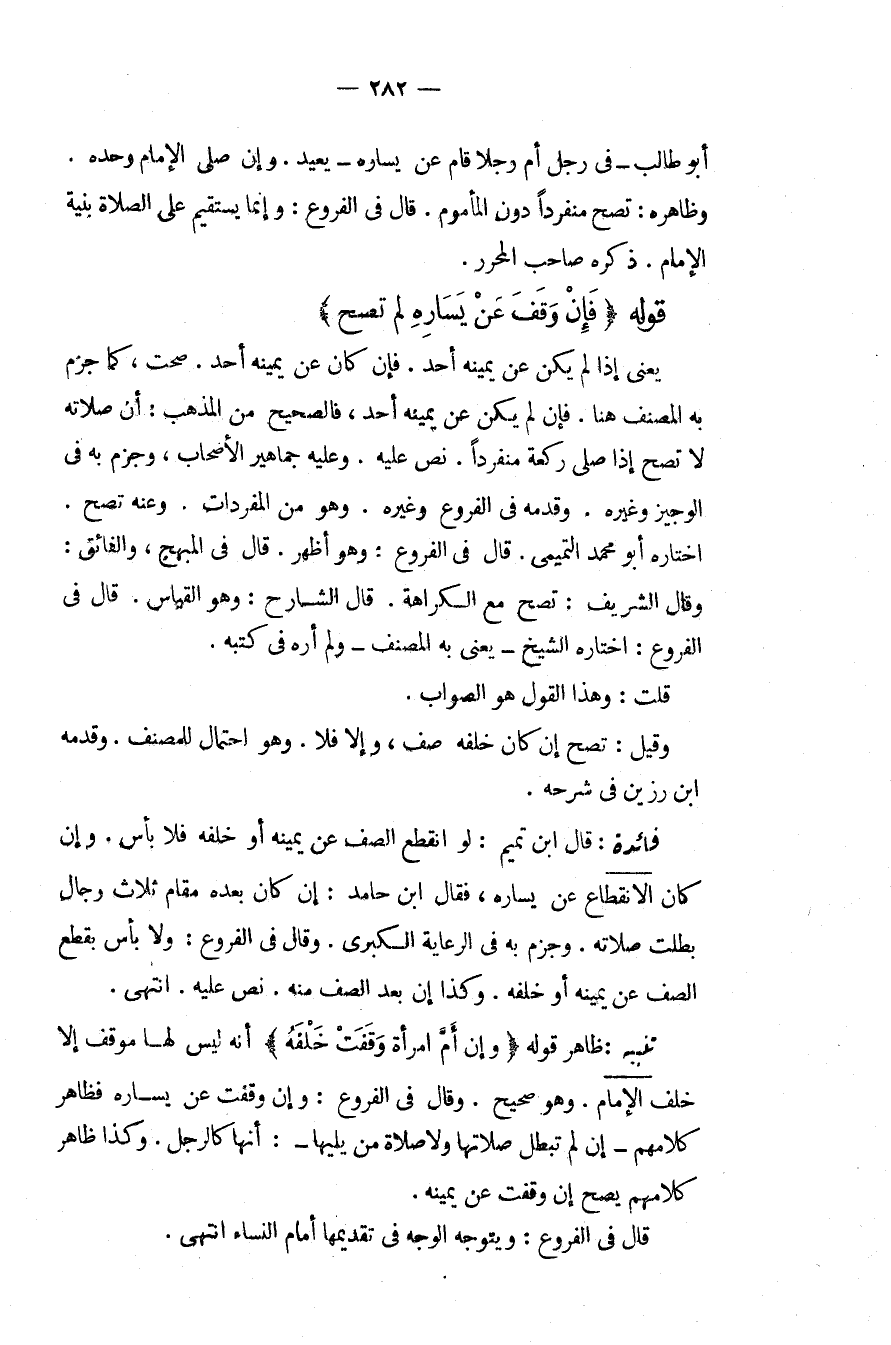 أَبُو طَالِبٍ فِي رَجُلٍ أَمَّ رَجُلًا قَامَ عَنْ يَسَارِهِ يُعِيدُ، وَإِنْ صَلَّى الْإِمَامُ وَحْدَهُ، وَظَاهِرُهُ: تَصِحُّ مُنْفَرِدًا دُونَ الْمَأْمُومِ قَالَ فِي الْفُرُوعِ: وَإِنَّمَا يَسْتَقِيمُ عَلَى الصَّلَاةِ بِنِيَّةِ الْإِمَامِ، ذَكَرَهُ صَاحِبُ الْمُحَرَّرِ قَوْلُهُ {فَإِنْ وَقَفَ عَنْ يَسَارِهِ لَمْ تَصِحَّ} يَعْنِي إذَا لَمْ يَكُنْ عَنْ يَمِينِهِ أَحَدٌ فَإِنْ كَانَ عَنْ يَمِينِهِ أَحَدٌ صَحَّتْ، كَمَا جَزَمَ بِهِ الْمُصَنِّفُ هُنَا فَإِنْ لَمْ يَكُنْ عَنْ يَمِينِهِ أَحَدٌ، فَالصَّحِيحُ مِنْ الْمَذْهَبِ: أَنَّ صَلَاتَهُ لَا تَصِحُّ إذَا صَلَّى رَكْعَةً مُنْفَرِدًا نَصَّ عَلَيْهِ، وَعَلَيْهِ جَمَاهِيرُ الْأَصْحَابِ، وَجَزَمَ بِهِ فِي الْوَجِيزِ وَغَيْرِهِ، وَقَدَّمَهُ فِي الْفُرُوعِ وَغَيْرِهِ، وَهُوَ مِنْ الْمُفْرَدَاتِ، وَعَنْهُ تَصِحُّ اخْتَارَهُ أَبُو مُحَمَّدٍ التَّمِيمِيُّ قَالَ فِي الْفُرُوعِ: وَهُوَ أَظْهَرُ قَالَ فِي الْمُبْهِجِ، وَالْفَائِقِ: وَقَالَ الشَّرِيفُ: تَصِحُّ مَعَ الْكَرَاهَةِ قَالَ الشَّارِحُ: وَهُوَ الْقِيَاسُ. قَالَ فِي الْفُرُوعِ: اخْتَارَهُ الشَّيْخُ يَعْنِي بِهِ الْمُصَنِّفَ وَلَمْ أَرَهُ فِي كُتُبِهِ. قُلْت: وَهَذَا الْقَوْلُ هُوَ الصَّوَابُ، وَقِيلَ: تَصِحُّ إنْ كَانَ خَلْفَهُ صَفٌّ، وَإِلَّا فَلَا، وَهُوَ احْتِمَالٌ لِلْمُصَنِّفِ وَقَدَّمَهُ ابْنُ رَزِينٍ فِي شَرْحِهِ.