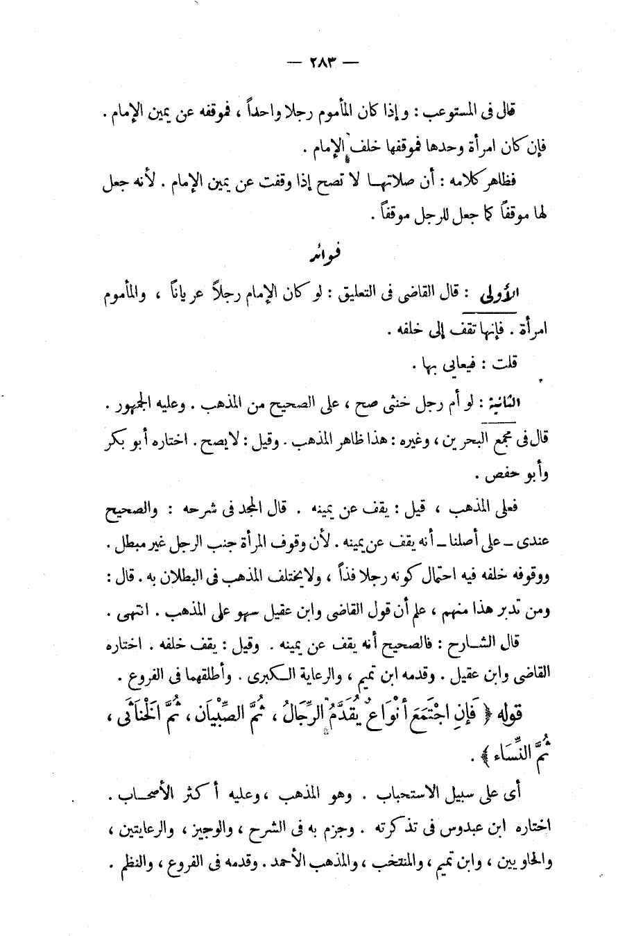 فَوَائِدُ. الْأُولَى: قَالَ الْقَاضِي فِي التَّعْلِيقِ: لَوْ كَانَ الْإِمَامُ رَجُلًا عُرْيَانًا، وَالْمَأْمُومُ امْرَأَةً فَإِنَّهَا تَقِفُ إلَى خَلْفِهِ قُلْت: فَيُعَايَى بِهَا.