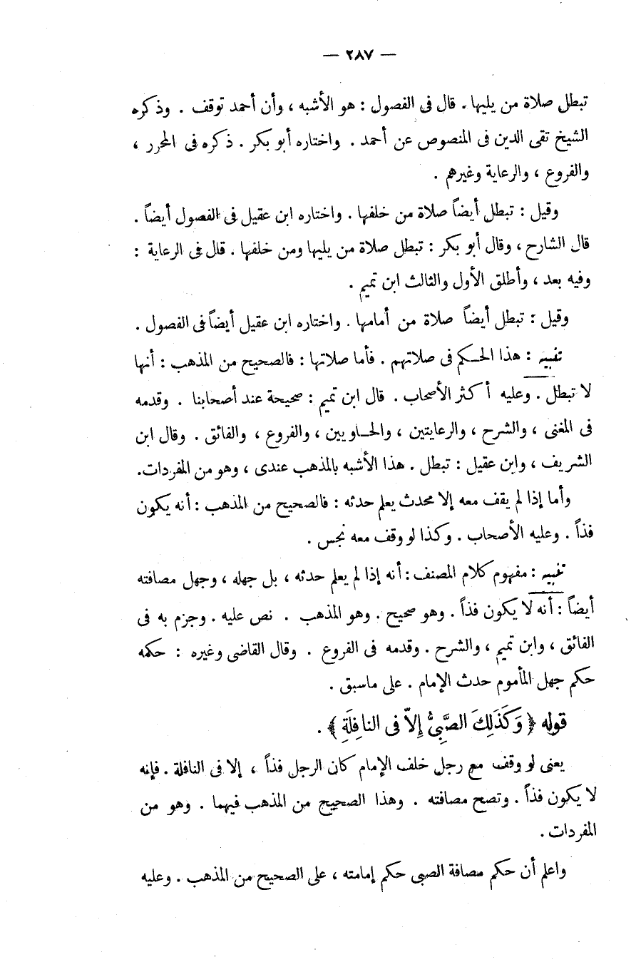 قَوْلُهُ {وَكَذَلِكَ الصَّبِيُّ إلَّا فِي النَّافِلَةِ} يَعْنِي لَوْ وَقَفَ مَعَ رَجُلٍ خَلْفَ الْإِمَامِ كَانَ الرَّجُلُ فَذًّا، إلَّا فِي النَّافِلَةِ فَإِنَّهُ لَا يَكُونُ فَذًّا، وَتَصِحُّ مُصَافَّتُهُ، وَهَذَا الصَّحِيحُ مِنْ الْمَذْهَبِ فِيهِمَا، وَهُوَ مِنْ الْمُفْرَدَاتِ، وَاعْلَمْ أَنَّ حُكْمَ مُصَافَّةِ الصَّبِيِّ حُكْمُ إمَامَتِهِ، عَلَى الصَّحِيحِ مِنْ الْمَذْهَبِ، وَعَلَيْهِ