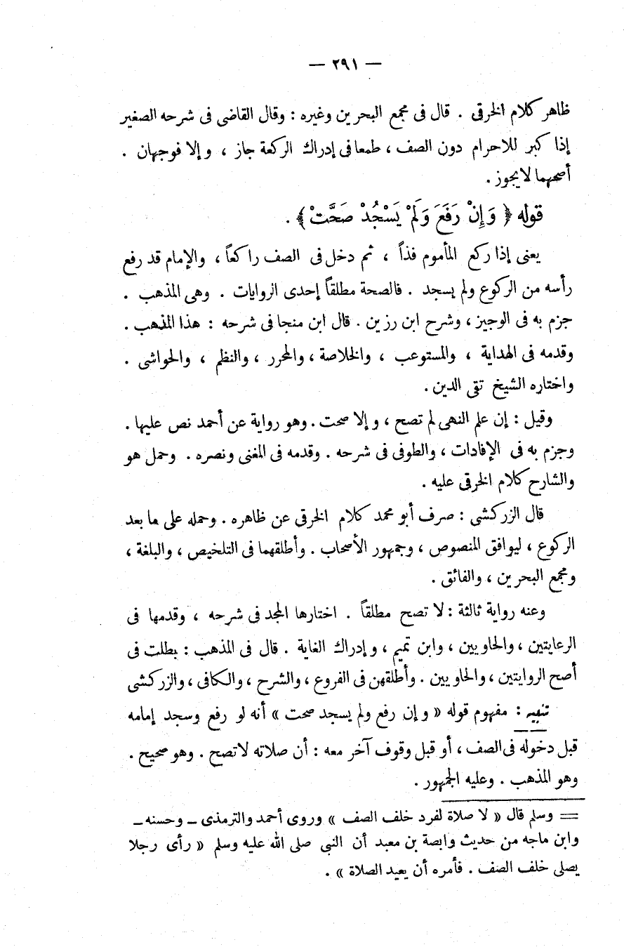 قَالَ الزَّرْكَشِيُّ: صَرَفَ أَبُو مُحَمَّدٍ كَلَامَ الْخِرَقِيِّ عَنْ ظَاهِرِهِ، وَحَمَلَهُ عَلَى مَا بَعْدَ الرُّكُوعِ، لِيُوَافِقَ الْمَنْصُوصَ، وَجُمْهُورَ الْأَصْحَابِ، وَأَطْلَقَهُمَا فِي التَّلْخِيصِ، وَالْبُلْغَةِ، وَمَجْمَعِ الْبَحْرَيْنِ، وَالْفَائِقِ، وَعَنْهُ رِوَايَةٌ ثَالِثَةٌ: لَا تَصِحُّ مُطْلَقًا اخْتَارَهَا الْمَجْدُ فِي شَرْحِهِ، وَقَدَّمَهَا فِي الرِّعَايَتَيْنِ، وَالْحَاوِيَيْنِ، وَابْنُ تَمِيمٍ، وَإِدْرَاكِ الْغَايَةِ قَالَ فِي الْمُذْهَبِ: بَطَلَتْ فِي أَصَحِّ الرِّوَايَتَيْنِ، وَالْحَاوِيَيْنِ، وَأَطْلَقَهُنَّ فِي الْفُرُوعِ، وَالشَّرْحِ، وَالْكَافِي، وَالزَّرْكَشِيُّ. تَنْبِيهٌ: مَفْهُومُ قَوْلِهِ " وَإِنْ رَفَعَ وَلَمْ يَسْجُدْ صَحَّتْ " أَنَّهُ لَوْ رَفَعَ وَسَجَدَ إمَامُهُ قَبْلَ دُخُولِهِ فِي الصَّفِّ، أَوْ قَبْلَ وُقُوفِ آخَرَ مَعَهُ: أَنَّ صَلَاتَهُ لَا تَصِحُّ، وَهُوَ صَحِيحٌ، وَهُوَ الْمَذْهَبُ، وَعَلَيْهِ الْجُمْهُورُ.