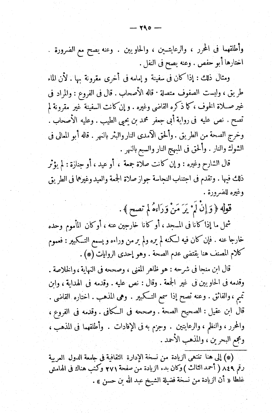 وَأَطْلَقَهُمَا فِي الْمُحَرَّرِ، وَالرِّعَايَتَيْنِ، وَالْحَاوِيَيْنِ، وَعَنْهُ يَصِحُّ مَعَ الضَّرُورَةِ اخْتَارَهَا أَبُو حَفْصٍ، وَعَنْهُ يَصِحُّ فِي النَّفْلِ، وَمِثَالُ ذَلِكَ: إذَا كَانَ فِي سَفِينَةٍ وَإِمَامُهُ فِي أُخْرَى مَقْرُونَةٍ بِهَا؛ لِأَنَّ الْمَاءَ طَرِيقٌ، وَلَيْسَتْ الصُّفُوفُ مُتَّصِلَةً، قَالَهُ الْأَصْحَابُ قَالَ فِي الْفُرُوعِ: وَالْمُرَادُ فِي غَيْرِ صَلَاةِ الْخَوْفِ، كَمَا ذَكَرَهُ الْقَاضِي وَغَيْرُهُ، وَإِنْ كَانَتْ السَّفِينَةُ غَيْرَ مَقْرُونَةٍ لَمْ تَصِحَّ نَصَّ عَلَيْهِ فِي رِوَايَةِ أَبِي جَعْفَرٍ مُحَمَّدِ بْنِ يَحْيَى الطَّيِّبِ، وَعَلَيْهِ الْأَصْحَابُ، وَخَرَّجَ الصِّحَّةَ مِنْ الطَّرِيقِ، وَأَلْحَقَ الْآمِدِيُّ النَّارَ وَالْبِئْرَ بِالنَّهْرِ، قَالَهُ أَبُو الْمَعَالِي فِي الشَّوْكِ وَالنَّارِ، وَأَلْحَقَ فِي الْمُبْهِجِ النَّارَ وَالسَّبُعَ بِالنَّهْرِ قَالَ الشَّارِحُ وَغَيْرُهُ: وَإِنْ كَانَتْ صَلَاةَ جُمُعَةٍ، أَوْ عِيدٍ، أَوْ جِنَازَةٍ: لَمْ يُؤَثِّرْ ذَلِكَ فِيهَا، وَتَقَدَّمَ فِي اجْتِنَابِ النَّجَاسَةِ جَوَازَ صَلَاةِ الْجُمُعَةِ وَالْعِيدِ وَغَيْرِهِمَا فِي الطَّرِيقِ وَغَيْرِهِ لِلضَّرُورَةِ.