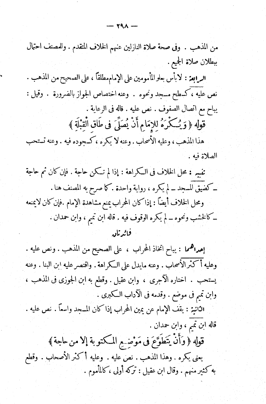 فَائِدَتَانِ. إحْدَاهُمَا: يُبَاحُ اتِّخَاذُ الْمِحْرَابِ، عَلَى الصَّحِيحِ مِنْ الْمَذْهَبِ وَنَصَّ عَلَيْهِ، وَعَلَيْهِ أَكْثَرُ الْأَصْحَابِ، وَعَنْهُ مَا يَدُلُّ عَلَى الْكَرَاهَةِ، وَاقْتَصَرَ عَلَيْهِ ابْنُ الْبَنَّا، وَعَنْهُ يُسْتَحَبُّ اخْتَارَهُ الْآجُرِّيُّ، وَابْنُ عَقِيلٍ وَقَطَعَ بِهِ ابْنُ الْجَوْزِيِّ فِي الْمُذْهَبِ، وَابْنُ تَمِيمٍ فِي مَوْضِعٍ وَقَدَّمَهُ فِي الْآدَابِ الْكُبْرَى.