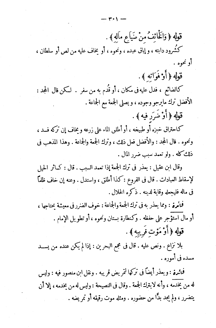 قَوْلُهُ {وَالْخَائِفُ مِنْ ضَيَاعِ مَالِهِ} كَشُرُودِ دَابَّتِهِ، وَإِبَاقِ عَبْدِهِ، وَنَحْوِهِ، أَوْ يَخَافُ عَلَيْهِ مِنْ لِصٍّ أَوْ سُلْطَانٍ، أَوْ نَحْوِهِ قَوْلُهُ {أَوْ فَوَاتِهِ} كَالضَّائِعِ، فَدُلَّ عَلَيْهِ فِي مَكَان، أَوْ قَدِمَ بِهِ مِنْ سَفَرٍ لَكِنْ قَالَ الْمَجْدُ: الْأَفْضَلُ تَرْكُ مَا يَرْجُو وُجُودَهُ، وَيُصَلِّي الْجُمُعَةَ مَعَ الْجَمَاعَةِ.