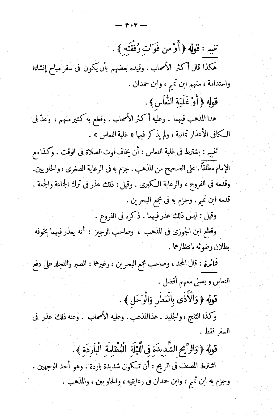 تَنْبِيهٌ: يُشْتَرَطُ فِي غَلَبَةِ النُّعَاسِ: أَنْ يَخَافَ فَوْتَ الصَّلَاةِ فِي الْوَقْتِ، وَكَذَا مَعَ الْإِمَامِ مُطْلَقًا، عَلَى الصَّحِيحِ مِنْ الْمَذْهَبِ جَزَمَ بِهِ فِي الرِّعَايَةِ الصُّغْرَى، وَالْحَاوِيَيْنِ وَقَدَّمَهُ فِي الْفُرُوعِ، وَالرِّعَايَةِ الْكُبْرَى، وَقِيلَ: ذَلِكَ عُذْرٌ فِي تَرْكِ الْجَمَاعَةِ وَالْجُمُعَةِ قَدَّمَهُ ابْنُ تَمِيمٍ وَجَزَمَ بِهِ فِي مَجْمَعِ الْبَحْرَيْنِ، وَقِيلَ: لَيْسَ ذَلِكَ عُذْرٌ فِيهِمَا، ذَكَرَهُ فِي الْفُرُوعِ وَقَطَعَ ابْنُ الْجَوْزِيِّ فِي الْمُذْهَبِ، وَصَاحِبُ الْوَجِيزِ: أَنَّهُ يُعْذَرُ فِيهِمَا بِخَوْفِهِ بُطْلَانَ وُضُوئِهِ بِانْتِظَارِهِمَا.