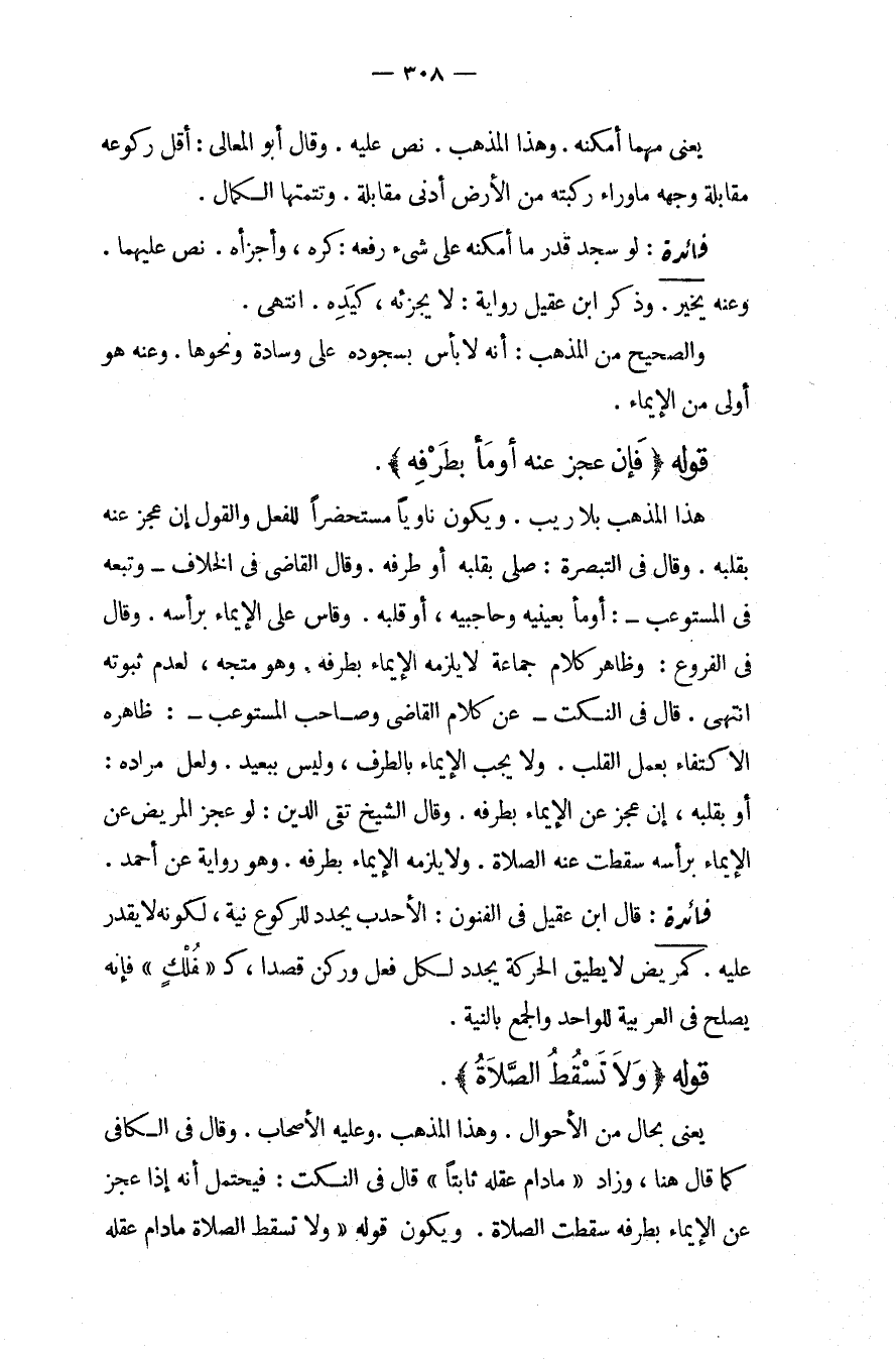 قَوْلُهُ {فَإِنْ عَجَزَ عَنْهُ} {أَوْمَأَ بِطَرْفِهِ} هَذَا الْمَذْهَبُ بِلَا رَيْبٍ، وَيَكُونُ نَاوِيًا مُسْتَحْضِرًا لِلْفِعْلِ وَالْقَوْلِ إنْ عَجَزَ عَنْهُ بِقَلْبِهِ، وَقَالَ فِي التَّبْصِرَةِ: صَلَّى بِقَلْبِهِ أَوْ طَرَفِهِ، وَقَالَ الْقَاضِي فِي الْخِلَافِ وَتَبِعَهُ فِي الْمُسْتَوْعِبِ: أَوْمَأَ بِعَيْنَيْهِ وَحَاجِبَيْهِ، أَوْ قَلْبِهِ. وَقَاسَ عَلَى الْإِيمَاءِ بِرَأْسِهِ، وَقَالَ فِي الْفُرُوعِ: وَظَاهِرُ كَلَامِ جَمَاعَةٍ لَا يَلْزَمُهُ الْإِيمَاءُ بِطَرَفِهِ، وَهُوَ مُتَّجَهٌ، لِعَدَمِ ثُبُوتِهِ انْتَهَى قَالَ فِي النُّكَتِ عَنْ كَلَامِ الْقَاضِي وَصَاحِبِ الْمُسْتَوْعِبِ: ظَاهِرُهُ الِاكْتِفَاءُ بِعَمَلِ الْقَلْبِ، وَلَا يَجِبُ الْإِيمَاءُ بِالطَّرْفِ، وَلَيْسَ بِبَعِيدٍ، وَلَعَلَّ مُرَادَهُ: أَوْ بِقَلْبِهِ، إنْ عَجَزَ عَنْ الْإِيمَاءِ بِطَرْفِهِ، وَقَالَ الشَّيْخُ تَقِيُّ الدِّينِ: لَوْ عَجَزَ الْمَرِيضُ عَنْ الْإِيمَاءِ بِرَأْسِهِ سَقَطَتْ عَنْهُ الصَّلَاةُ، وَلَا يَلْزَمُهُ الْإِيمَاءُ بِطَرْفِهِ، وَهُوَ رِوَايَةٌ عَنْ أَحْمَدَ، فَائِدَةٌ: قَالَ ابْنُ عَقِيلٍ فِي الْفُنُونِ: الْأَحْدَبُ يُجَدِّدُ لِلرُّكُوعِ نِيَّةً، لِكَوْنِهِ لَا يَقْدِرُ عَلَيْهِ كَمَرِيضٍ لَا يُطِيقُ الْحَرَكَةَ يُجَدِّدُ لِكُلِّ فِعْلٍ وَرُكْنٍ قَصْدًا، كَ " فُلْكٍ " فَإِنَّهُ يَصْلُحُ فِي الْعَرَبِيَّةِ لِلْوَاحِدِ وَالْجَمْعِ بِالنِّيَّةِ.