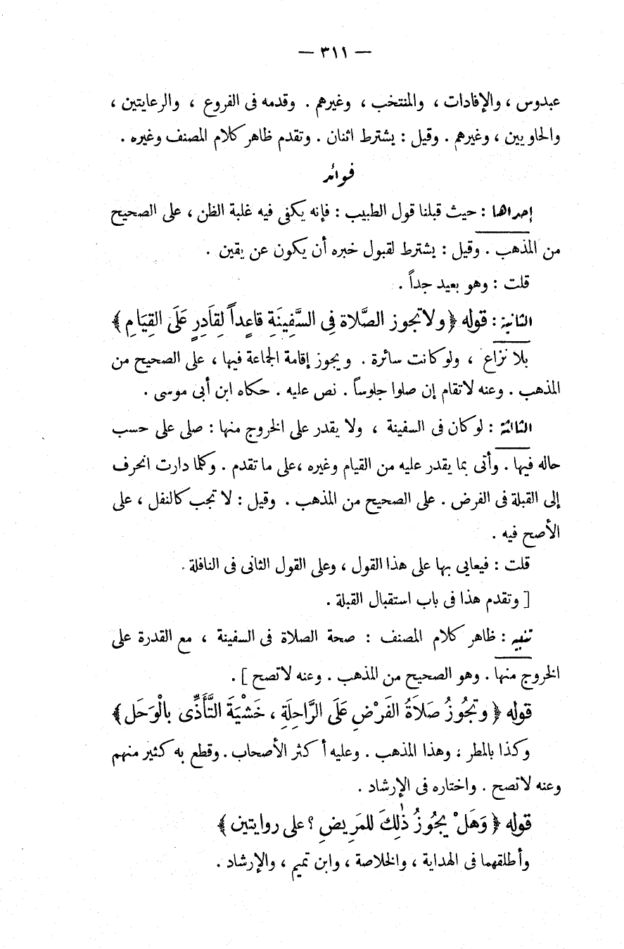 وَتَذْكِرَةِ ابْنِ عَبْدُوسٍ، وَالْإِفَادَاتِ، وَالْمُنْتَخَبِ، وَغَيْرِهِمْ وَقَدَّمَهُ فِي الْفُرُوعِ، وَالرِّعَايَتَيْنِ، وَالْحَاوِيَيْنِ، وَغَيْرِهِمْ، وَقِيلَ: يُشْتَرَطُ اثْنَانِ، وَتَقَدَّمَ ظَاهِرُ كَلَامِ الْمُصَنِّفِ وَغَيْرِهِ. فَوَائِدُ. إحْدَاهُمَا: حَيْثُ قَبِلْنَا قَوْلَ الطَّبِيبِ: فَإِنَّهُ يَكْفِي فِيهِ غَلَبَةُ الظَّنِّ، عَلَى الصَّحِيحِ مِنْ الْمَذْهَبِ، وَقِيلَ: يُشْتَرَطُ لِقَبُولِ خِبْرَةٍ أَنْ يَكُونَ عَنْ يَقِينٍ. قُلْت: وَهُوَ بَعِيدٌ جِدًّا.
