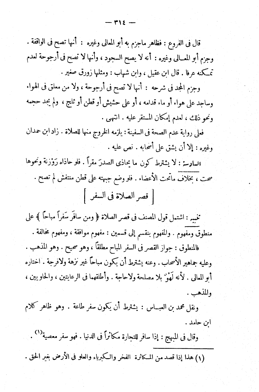 [قَصْرُ الصَّلَاةِ فِي السَّفَرِ] تَنْبِيهٌ: اشْتَمَلَ قَوْلُ الْمُصَنِّفِ فِي قَصْرِ الصَّلَاةِ {وَمَنْ سَافَرَ سَفَرًا مُبَاحًا} عَلَى مَنْطُوقٍ وَمَفْهُومٍ، وَالْمَفْهُومُ يَنْقَسِمُ إلَى قِسْمَيْنِ: مَفْهُومُ مُوَافَقَةٍ، وَمَفْهُومُ مُخَالَفَةٍ فَالْمَنْطُوقُ: جَوَازُ الْقَصْرِ فِي السَّفَرِ الْمُبَاحِ مُطْلَقًا، وَهُوَ صَحِيحٌ، وَهُوَ الْمَذْهَبُ، وَعَلَيْهِ جَمَاهِيرُ الْأَصْحَابِ، وَعَنْهُ يُشْتَرَطُ أَنْ يَكُونَ مُبَاحًا غَيْرَ نُزْهَةٍ وَلَا فُرْجَةٍ اخْتَارَهُ أَبُو الْمَعَالِي؛ لِأَنَّهُ لَهْوٌ بِلَا مَصْلَحَةٍ وَلَا حَاجَةٍ، وَأَطْلَقَهُمَا فِي الرِّعَايَتَيْنِ، وَالْحَاوِيَيْنِ، وَالْمُذْهَبِ، وَنَقَلَ مُحَمَّدُ بْنُ الْعَبَّاسِ: يُشْتَرَطُ أَنْ يَكُونَ سَفَرَ طَاعَةٍ، وَهُوَ ظَاهِرُ كَلَامِ ابْنِ حَامِدٍ، وَقَالَ فِي الْمُبْهِجِ: إذَا سَافَرَ لِلتِّجَارَةِ مُكَاثِرًا فِي الدُّنْيَا فَهُوَ سَفَرُ مَعْصِيَةٍ.