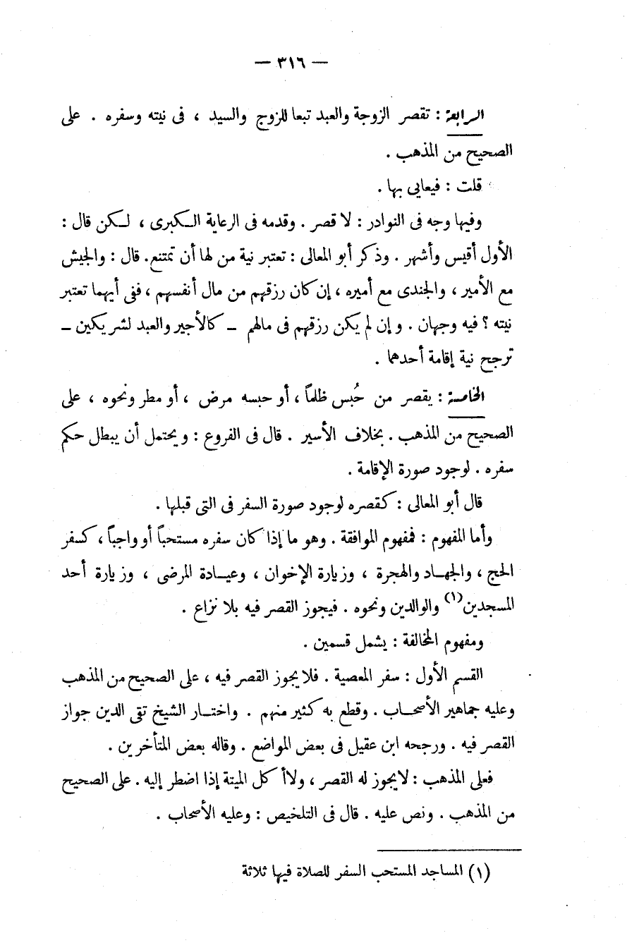 الْخَامِسَةُ: يَقْصُرُ مَنْ حُبِسَ ظُلْمًا، أَوْ حَبَسَهُ مَرَضٌ، أَوْ مَطَرٌ وَنَحْوُهُ، عَلَى الصَّحِيحِ مِنْ الْمَذْهَبِ بِخِلَافِ الْأَسِيرِ قَالَ فِي الْفُرُوعِ: يُحْتَمَلُ أَنْ يَبْطُلَ حُكْمُ سَفَرِهِ؛ لِوُجُودِ صُورَةِ الْإِقَامَةِ قَالَ أَبُو الْمَعَالِي: كَقَصْرِهِ لِوُجُودِ صُورَةِ السَّفَرِ فِي الَّتِي قَبْلَهَا، وَأَمَّا الْمَفْهُومُ: فَمَفْهُومُ الْمُوَافَقَةِ، وَهُوَ مَا إذَا كَانَ سَفَرُهُ مُسْتَحَبًّا أَوْ وَاجِبًا، كَسَفَرِ الْحَجِّ، وَالْجِهَادِ وَالْهِجْرَةِ، وَزِيَارَةِ الْإِخْوَانِ، وَعِيَادَةِ الْمَرْضَى، وَزِيَارَةِ أَحَدِ الْمَسْجِدَيْنِ وَالْوَالِدَيْنِ وَنَحْوِهِ فَيَجُوزُ الْقَصْرُ فِيهِ بِلَا نِزَاعٍ. وَمَفْهُومُ الْمُخَالَفَةِ: يَشْمَلُ قِسْمَيْنِ. الْقِسْمُ الْأَوَّلُ: سَفَرُ الْمَعْصِيَةِ فَلَا يَجُوزُ الْقَصْرُ فِيهِ، عَلَى الصَّحِيحِ مِنْ الْمَذْهَبِ وَعَلَيْهِ جَمَاهِيرُ الْأَصْحَابِ وَقَطَعَ بِهِ كَثِيرٌ مِنْهُمْ وَاخْتَارَ الشَّيْخُ تَقِيُّ الدِّينِ جَوَازَ الْقَصْرِ فِيهِ وَرَجَّحَهُ ابْنُ عَقِيلٍ فِي بَعْضِ الْمَوَاضِعِ، وَقَالَهُ بَعْضُ الْمُتَأَخِّرِينَ فَعَلَى الْمَذْهَبِ: لَا يَجُوزُ لَهُ الْقَصْرُ، وَلَا أَكْلُ الْمَيْتَةِ إذَا اُضْطُرَّ إلَيْهِ، عَلَى الصَّحِيحِ مِنْ الْمَذْهَبِ وَنَصَّ عَلَيْهِ قَالَ فِي التَّلْخِيصِ: وَعَلَيْهِ الْأَصْحَابُ.