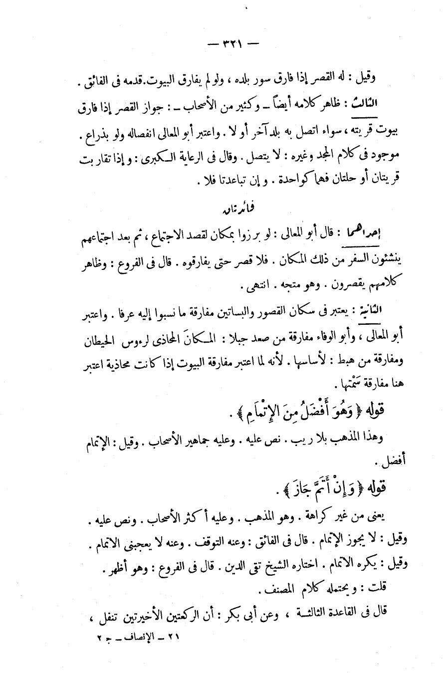 قَوْلُهُ {وَهُوَ أَفْضَلُ مِنْ الْإِتْمَامِ} ، وَهَذَا الْمَذْهَبُ بِلَا رَيْبٍ نَصَّ عَلَيْهِ، وَعَلَيْهِ جَمَاهِيرُ الْأَصْحَابِ، وَقِيلَ: الْإِتْمَامُ أَفْضَلُ قَوْلُهُ {وَإِنْ أَتَمَّ} {جَازَ} يَعْنِي مِنْ غَيْرِ كَرَاهَةٍ، وَهُوَ الْمَذْهَبُ، وَعَلَيْهِ أَكْثَرُ الْأَصْحَابِ، وَنَصَّ عَلَيْهِ، وَقِيلَ: لَا يَجُوزُ الْإِتْمَامُ قَالَ فِي الْفَائِقِ: وَعَنْهُ التَّوَقُّفُ، وَعَنْهُ لَا يُعْجِبُنِي الْإِتْمَامُ، وَقِيلَ: يُكْرَهُ الْإِتْمَامُ اخْتَارَهُ الشَّيْخُ تَقِيُّ الدِّينِ قَالَ فِي الْفُرُوعِ: وَهُوَ أَظْهَرُ، قُلْت: وَيَحْتَمِلُهُ كَلَامُ الْمُصَنِّفِ قَالَ فِي الْقَاعِدَةِ الثَّالِثَةِ، وَعَنْ أَبِي بَكْرٍ: أَنَّ الرَّكْعَتَيْنِ الْأَخِيرَتَيْنِ تَنَفُّلٌ،